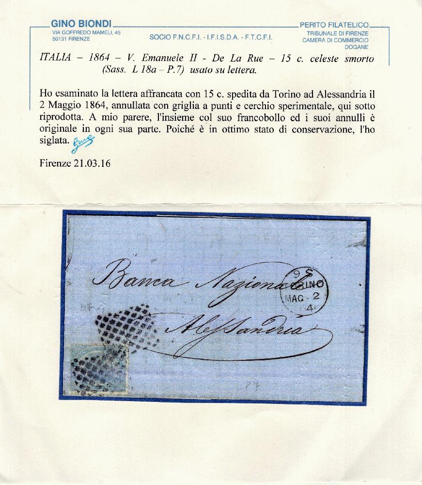 | Zusatzinformationen und Suchstichworte: | Übersetzung: Ich habe den mit 15 c. frankierten Brief von Torino nach Alessandria vom 2. Mai 1864 untersucht, der mit einem Punktraster und einem Versuchskreis entwertet wurde, wie unten abgebildet. Meines Erachtens ist das Ganze mit seinem Stempel und seinen Abstempelungen in allen Teilen original, da es sich in einem ausgezeichneten Erhaltungszustand befindet. Ich habe es unterschrieben. |