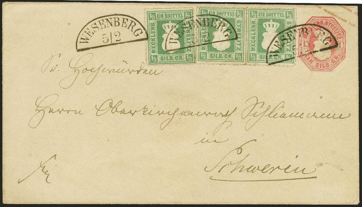 | Zusatzinformationen und Suchstichworte: | 370. Auktion Heinrich Köhler 8. Juni 2019 Los 147 1864, 1/3 Silbergroschen olivgrün, waagerechtes Paar und Einzelmarke, farbfrisch und einwandfrei durchstochen, mit dreimal sauber aufgesetztem Segmentstempel "WESENBERG 5/2" als Zufrankatur auf Ganzsachenumschlag 1 Silbergroschen rosa nach Schwerin mit rückseitigem Ausgabestempel vom nächsten Tag. Bei diesem Stück handelt es sich um einen der seltensten und auch attraktivsten Briefe der Mecklenburg-Philatelie: einzig bekannte Ganzsache mit einer reinen Zufrankatur der 1. Ausgabe und einmalige Darstellung des 2 Silbergroschen-Portos. Ein sensationelles und altbekanntes Stück. Fotoattest Berger BPP (1984) Ausruf 25.000,00 EUR Zuschlag 30.000,00 EUR (aus der Sammlung Erivan Haub) |