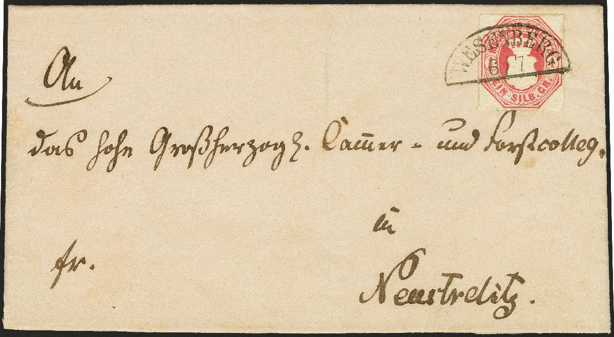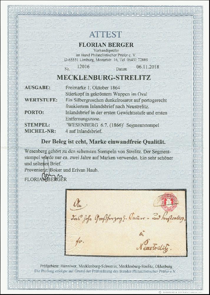 | Zusatzinformationen und Suchstichworte: | 370. Auktion Heinrich Köhler 8. Juni 2019 Los 148 1864, Wappen im Hochformat 1 Silbergroschen dunkelrosarot, farbfrisch und tadellos durchstochen, mit glasklar aufgesetztem Segmentstempel "WESENBERG 6/7" (1866) auf komplettem Faltbrief nach Neustrelitz. Ein besonders schönes Ganzstück dieses außerordentlich seltenen Stempels, von dem wir lediglich 2 weitere Ganzsstücke (einschließlich des vorangegangenen Loses) registriert haben. Fotoattest Berger BPP (2018) Ausruf 300,00 EUR Zuschlag 3.200,00 EUR (aus der Sammlung Erivan Haub) |