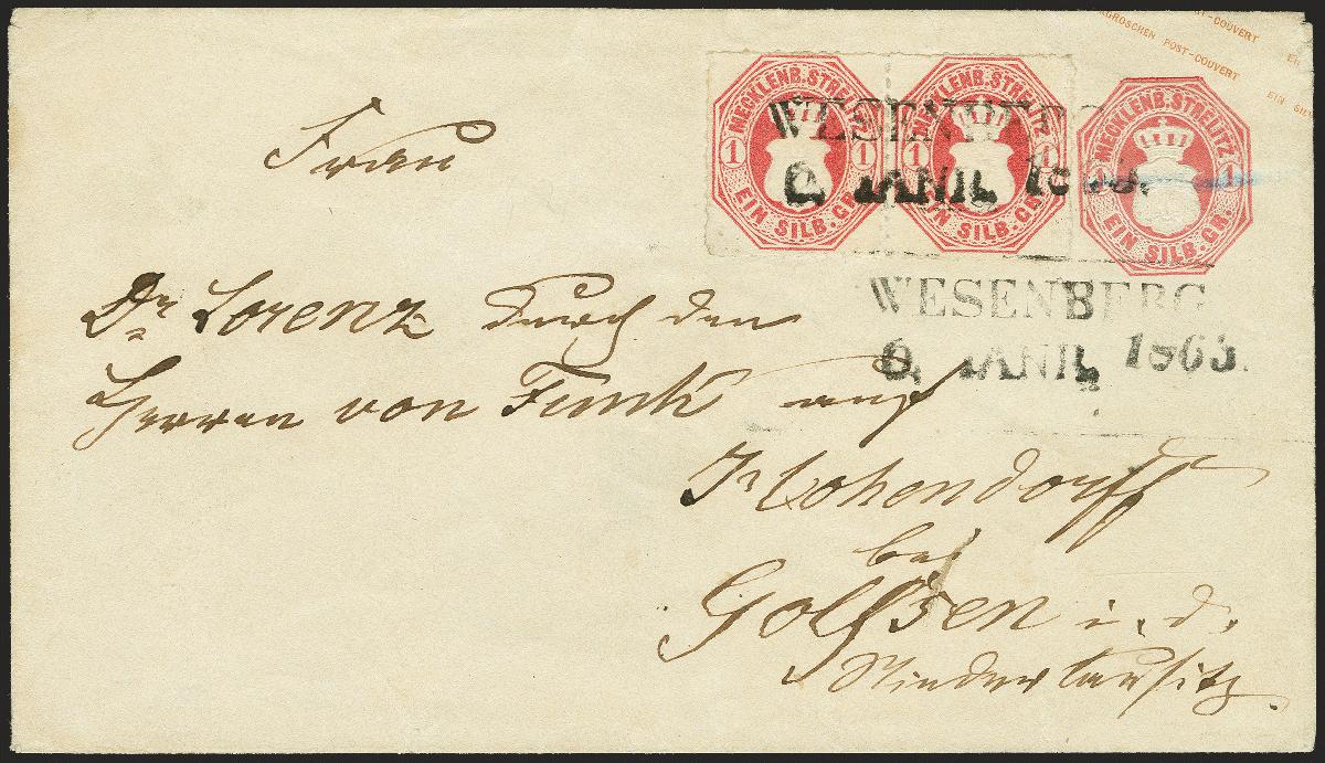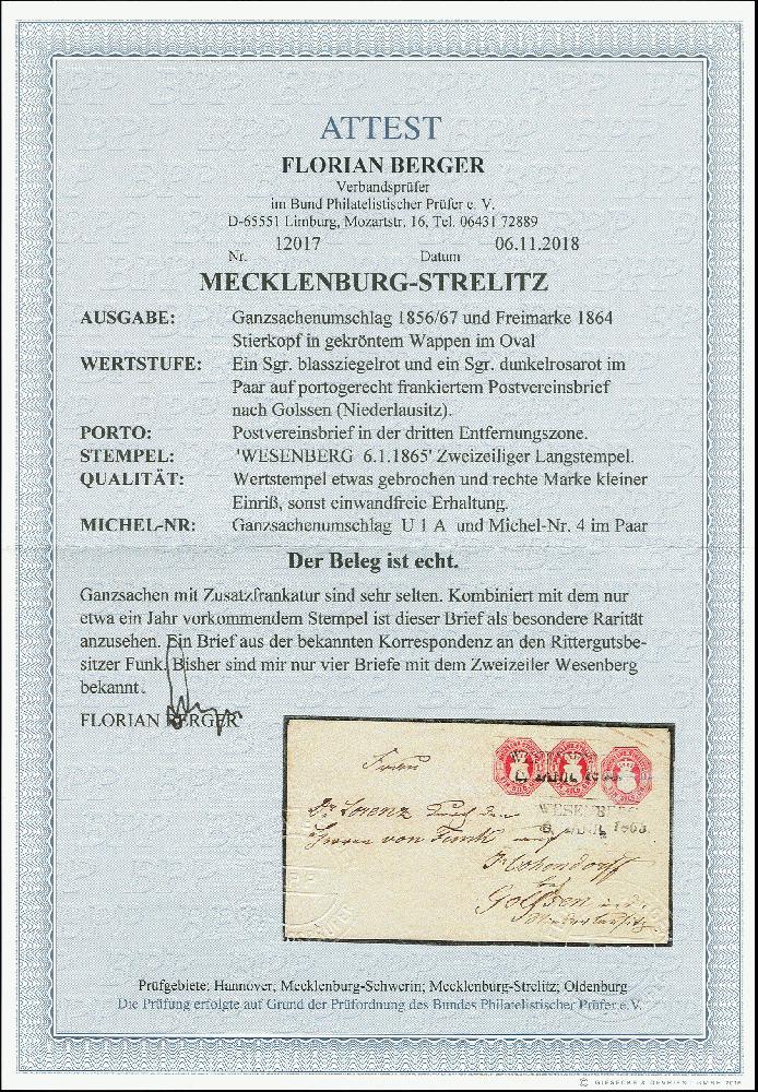 | Zusatzinformationen und Suchstichworte: | 370. Auktion Heinrich Köhler 8. Juni 2019 Los 149 1 Silbergroschen dunkelrosarot im waagerechten Paar, farbfrisch und gut durchstochen als Zufrankatur auf Ganzsachenumschlag 1 Silbergroschen mit sauber auf- und nebengesetztem Langstempel "WESENBERG 6. JANR 1865" nach Hohendorff bei Golßen in der Niederlausitz. Rechte Marke des Paares kleiner Einriss und der Wertstempel der Ganzsache am Unterrand des Wappens gering gebrochen, sonst gute und schöne Erhaltung. Paare sind die größte gebrauchten Einheiten dieser Marke; als Zufrankatur auf wertstufengleicher Ganzsache haben wir kein weiteres Stück registriert. Fotoattest Berger BPP Ausruf 1.000,00 EUR Zuschlag 4.200,00 EUR (aus der Sammlung Erivan Haub) |