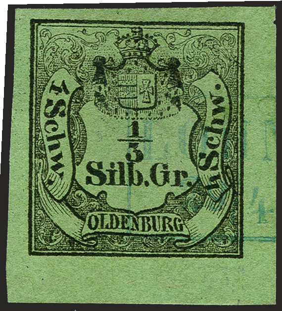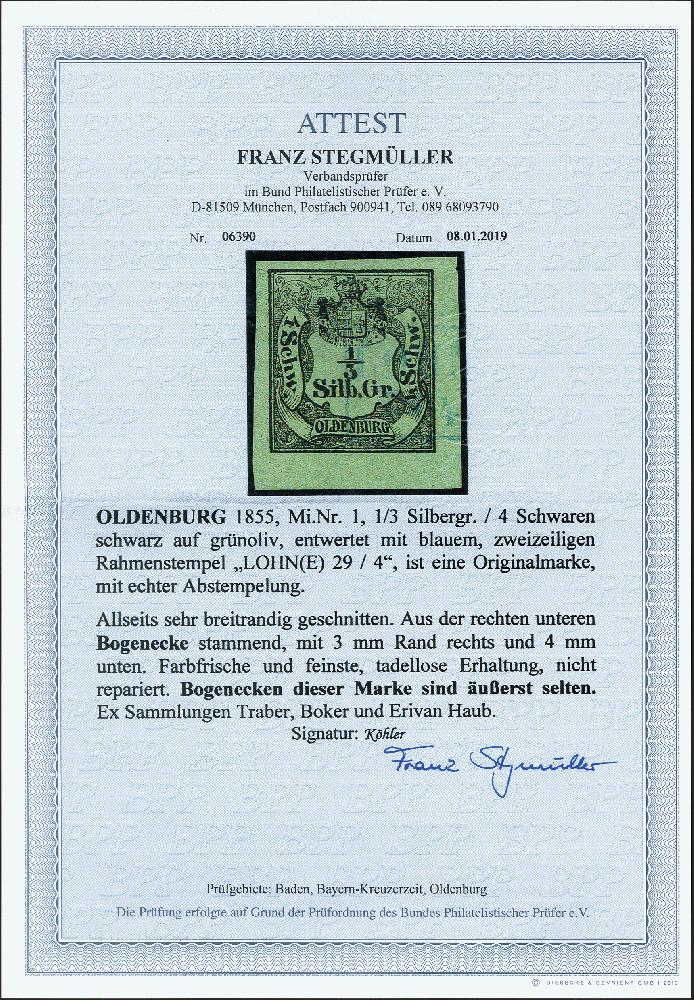 | Zusatzinformationen und Suchstichworte: | 370. Auktion Heinrich Köhler 8. Juni 2019 Los 150 1852, Oldenburgisches Hauswappen 1/3 Silbergroschen auf grün, allseits breitrandige rechte untere Bogenecke mit 3/4 mm Bogenrändern, leicht und sauber entwertet durch Rahmenstempel "LOHNE 29/4". Ein wunderschönes farbfrisches Stück in unübertrefflicher Erhaltung. Signiert Köhler und private Signatur, Fotoattest Stegmüller BPP (2019) Ausruf 1.000,00 EUR Zuschlag 3.400,00 EUR (aus der Sammlung Erivan Haub) |