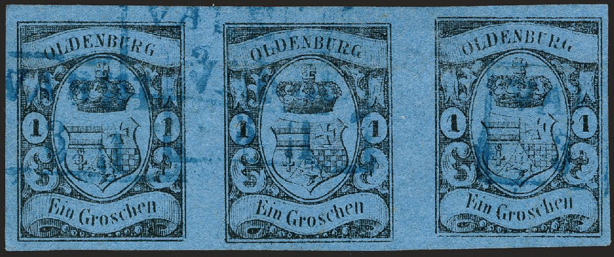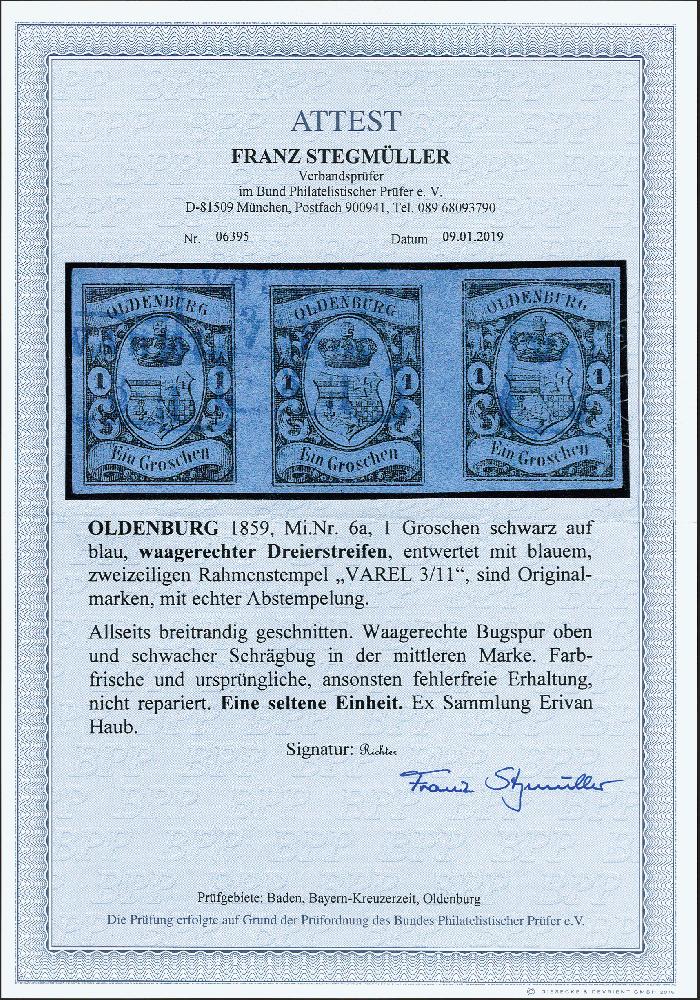 | Zusatzinformationen und Suchstichworte: | 370. Auktion Heinrich Köhler 8. Juni 2019 Los 159 1859, 1 Groschen auf blau im waagerechten 3er-Streifen mit den weiten Abständen der 1. Auflage, voll- bis breitrandig und farbfrisch, leicht entwertet durch Rahmenstempel "VAREL 3/11"; bis auf leichte Bugspuren einwandfrei. Eine seltene Einheit. Fotoattest Stegmüller BPP (2019) Ausruf 500,00 EUR Zuschlag 1.400,00 EUR (aus der Sammlung Erivan Haub) |
