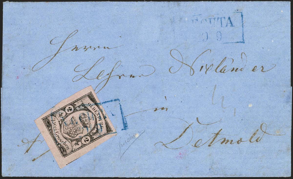 | Zusatzinformationen und Suchstichworte: | 370. Auktion Heinrich Köhler 8. Juni 2019 Los 161 1859, 2 Groschen auf rosa, farbfrisch und allseits breit- bis überrandig, rechts unten mit Teil der Nachbarmarke, mit auf- und nebengesetztem blauen Rahmenstempel "VECHTA 29/9" (1860) auf kleiner Briefhülle nach Detmold. Die Marke war zur Kontrolle gelöst und klebt leicht versetzt. Ein Ausnahmestück in einwandfreier Erhaltung. Handschriftlich signiert Friedl sowie Fotoattest Stegmüller BPP (2019) Ausruf 1.000,00 EUR Zuschlag 1.900,00 EUR (aus der Sammlung Erivan Haub) |