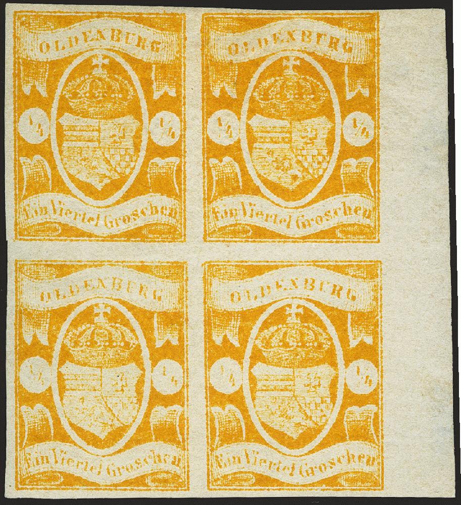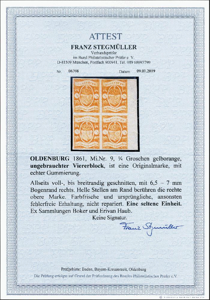 | Zusatzinformationen und Suchstichworte: | 370. Auktion Heinrich Köhler 8. Juni 2019 Los 164 1861, ¼ Groschen gelborange im waagerechten 4er-Block, voll- bis breitrandig, rechts mit 6,5-7 mm Bogenrand, ungebraucht mit Originalgummi. Einige helle Stellen im Bogenrand, davon die rechte obere Marke etwas tangiert, sonst einwandfrei. Eine seltene und attraktive Einheit. Fotoattest Stegmüller BPP (2019) Ausruf 2.000,00 EUR Zuschlag 2.800,00 EUR (aus der Sammlung Erivan Haub) |