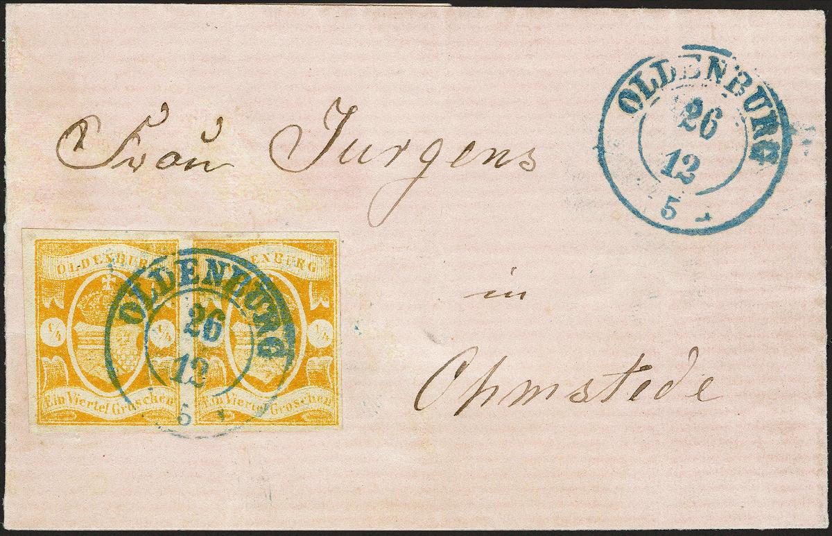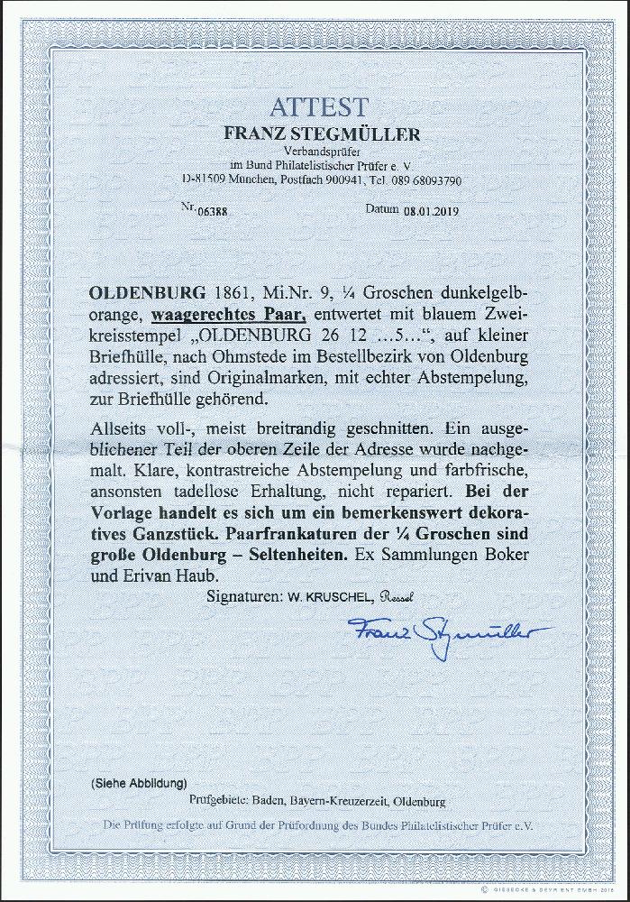 | Zusatzinformationen und Suchstichworte: | 370. Auktion Heinrich Köhler 8. Juni 2019 Los 165 ¼ Groschen gelborange im waagerechten Paar, rechts voll- sonst allseits breitrandig und sehr schön farbfrisch, mit einem zentrisch und gerade aufgesetztem blauen Doppelkreisstempel "OLDENBURG 26 12", zusätzlich nebengesetzt, auf kleiner rosafarbener Briefhülle nach Ohmstede im Bestellbezirk von Oldenburg. Kleiner Teil der Adresse nachgezogen, sonst völlig tadellose und besonders schöne Erhaltung; nach unserer Meinung die attraktivste Doppelfrankatur dieser Marke. Signiert Ressel und Kruschel sowie Fotoattest Stegmüller BPP (2019) Ausruf 20.000,00 EUR Zuschlag 20.000,00 EUR (aus der Sammlung Erivan Haub) |