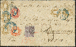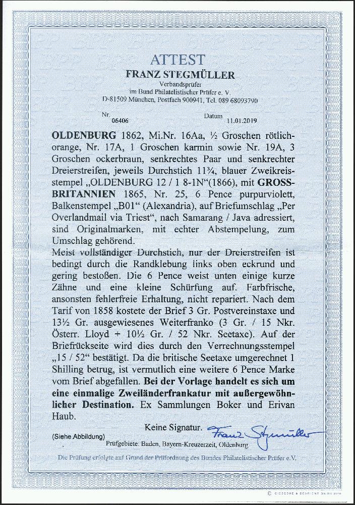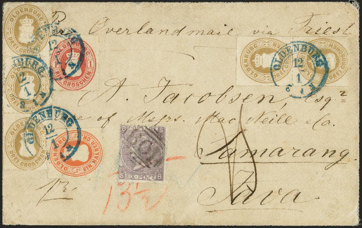 | Zusatzinformationen und Suchstichworte: | 370. Auktion Heinrich Köhler 8. Juni 2019 Los 168 1862, Prägedruckausgabe ½ Groschen rötlichorange, 1 Groschen karmin und 3 Groschen ockerbraun im senkrechten Paar und 3er-Streifen, alle farbfrisch und mit meist vollständigem Durchstich, lediglich der 3er-Streifen bedingt durch die Randklebung links oben eckrund und gering bestoßen, mit blauem Doppelkreisstempel "OLDENBURG 12/1" (1866) auf Leinen-Kuvert über Triest, Alexandrien und die 'Overlandmail' nach Samarang auf Java mit rückseitigen Transit- und Ankunftsstempeln sowie dem Verrechnungsstempel "15/52" in großer Type. Der Brief war bezahlt und frankiert bis Singapur mit 16½ Groschen, davon 3 Groschen Postvereinsgebühr, 3 Groschen (= 15 Neukreuzer) österreichisches Seepostporto bis Alexandria sowie 10½ Groschen (= 52 Neukreuzer) britisches Seeporto bis Singapur. Das britische Porto ursprünglich in Form von zwei 6 Pence-Marken frankiert, entwertet durch "B 01" von Alexandria, davon 1 Marke abgefallen. Das Porto für die Beförderung von Singapur nach Java mit holländischen Schiffen wurde vom Empfänger in Höhe von "25" Cents eingezogen. Die britische Marke unten rechts unauffällige Schürfung, sonst - insbesondere für diesen Leitweg - sehr gut Erhaltung. Der wohl außergewöhnlichste Auslandsbrief Oldenburgs. Fotoattest Stegmüller BPP (2019) Ausruf 8.000,00 EUR Zuschlag 18.000,00 EUR (aus der Sammlung Erivan Haub) |