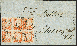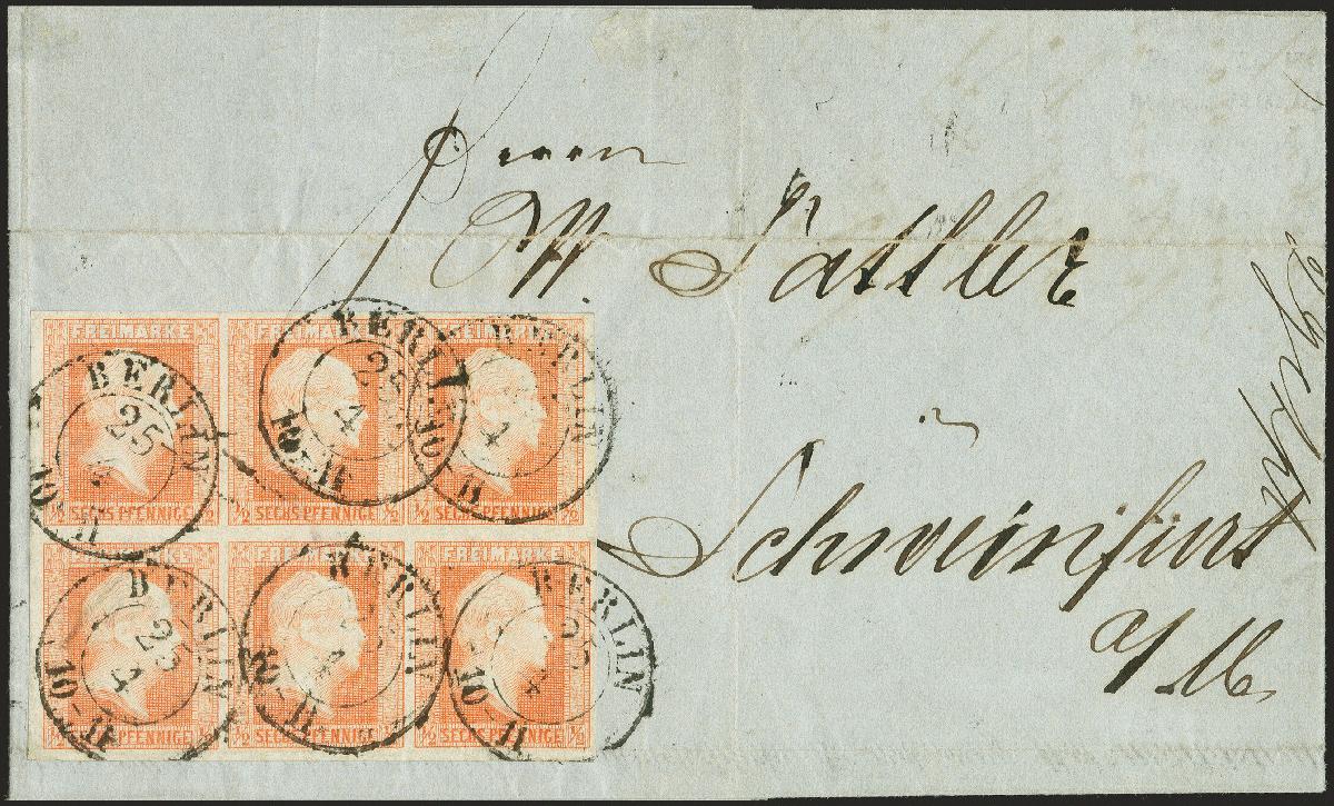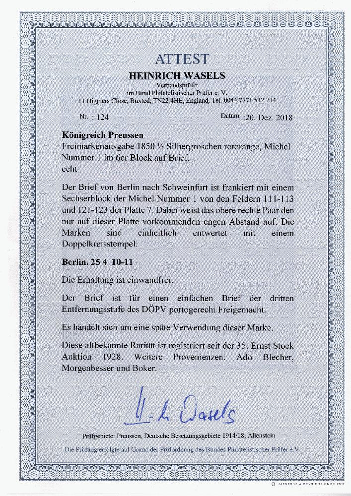 | Zusatzinformationen und Suchstichworte: | 370. Auktion Heinrich Köhler 8. Juni 2019 Los 175 1850, Kopfausgabe auf Wasserzeichenpapier ½ Silbergroschen rotorange im waagerechten 6er-Block der Platte 7, dabei das rechte obere Paar mit dem nur auf dieser Platte vorkommenden 'engen Abstand' und den dadurch bedingten 'weiten Abstand' rechts sehr schön sichtbar, farbfrisch und voll- bis breitrandig mit kleinem Doppelkreisstempel "BERLIN 25 4" (1862) auf Faltbrief nach Schweinfurt mit Ankunftsstempel. Der Brief außerhalb der Frankatur gefaltet, der seltene Block selbst in tadelloser Erhaltung. Einzig bekanntes Blockstück mit der außerordentlich seltenen Abart auf Brief und eine außerordentlich späte Verwendung dieser Marke. Eine der großen Kostbarkeiten der Preußen-Philatelie. Fotoattest Wasels BPP (2018) Ausruf 15.000,00 EUR Zuschlag 50.000,00 EUR (aus der Sammlung Erivan Haub) |
