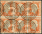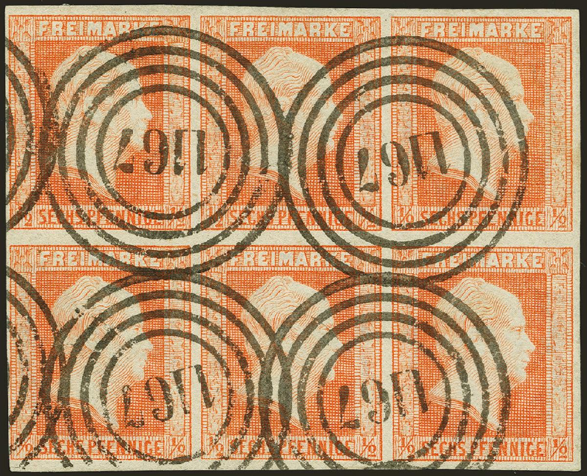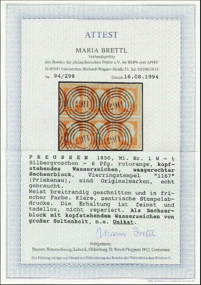 | Zusatzinformationen und Suchstichworte: | 370. Auktion Heinrich Köhler 8. Juni 2019 Los 176 1850, König Friedrich Wilhelm IV auf Papier mit Wasserzeichen, ½ Silbergroschen rotorange mit kopfstehendem Wasserzeichen im waagerechten 6er-Block. Schöne frische leuchtende Farbe und allseits voll- bis breitrandig, sauber entwertet mit Nummernstempel "1167" PRIMKENAU. Schöne und tadellose Erhaltung. Wir haben keine weitere derart große Einheit mit kopfstehendem Wasserzeichen registriert. Fotoattest Brettl BPP (1994) Ausruf 2.000,00 EUR Zuschlag 6.000,00 EUR (aus der Sammlung Erivan Haub) |
