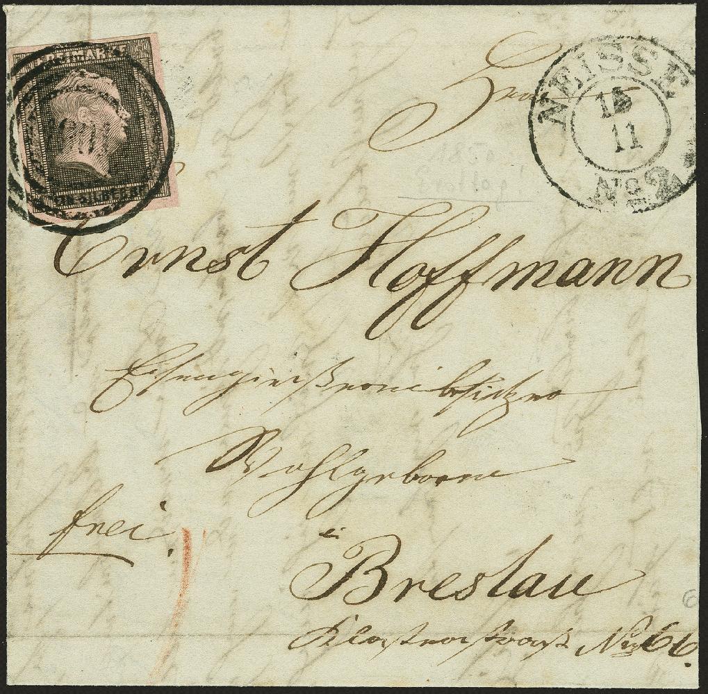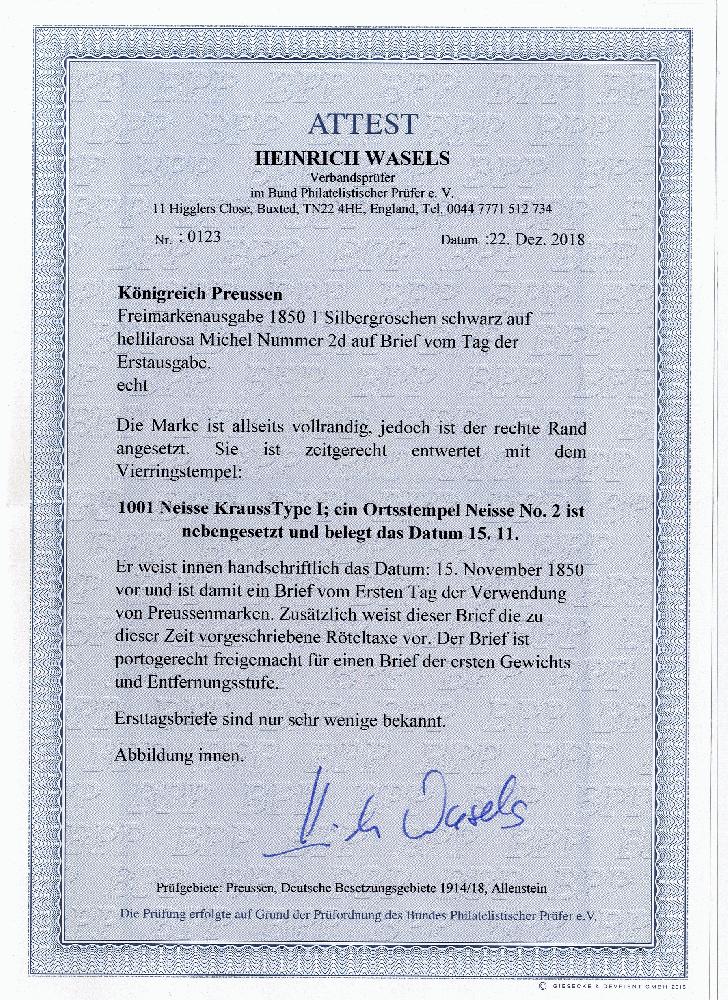 | Zusatzinformationen und Suchstichworte: | 370. Auktion Heinrich Köhler 8. Juni 2019 Los 177 1 Silbergroschen auf helllilarosa in typischer Nuance der Erstausgabe, dreiseitig voll- bis breitrandig, der rechte Rand aus optischen Gründen ergänzt, mit leicht aufgesetztem Nummernstempel "1001" und nebengesetztem Doppelkreisstempel vom Tag der Ausgabe "NEISSE 15 11" auf komplettem Faltbrief nach Breslau mit rückseitigen Ausgabestempeln. Ein attraktiver und seltener Ersttagsbrief. Signiert Meier BPP und Fotoattest Wasels BPP (2018) Ausruf 1.000,00 EUR Zuschlag 2.200,0 EUR (aus der Sammlung Erivan Haub) |