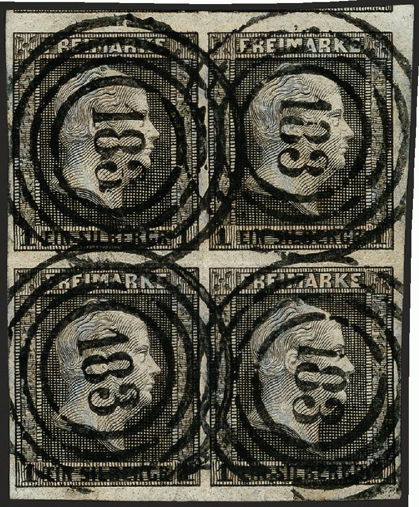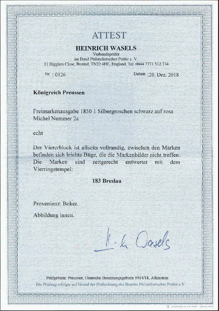| Zusatzinformationen und Suchstichworte: | 370. Auktion Heinrich Köhler 8. Juni 2019 Los 178 1850, 1 Silbergroschen auf rosa im 4er-Block, allseits gut voll- bis überrandig, oben mit Teilen von zwei Nachbarmarken, sehr schön entwertet durch Nummernstempel "183" BRESLAU, leichte Vorfalte- bzw. -büge zwischen den Marken berühren diese nicht; ein schöner Block. Fotoattest Wasels BPP (2018) Ausruf 500,00 EUR Zuschlag 700,00 EUR (aus der Sammlung Erivan Haub) |