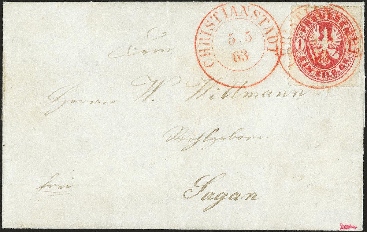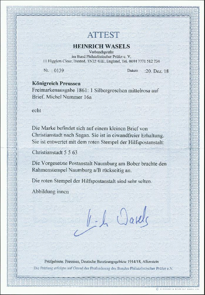 | Zusatzinformationen und Suchstichworte: | 370. Auktion Heinrich Köhler 8. Juni 2019 Los 228 1861, Wappen 1 Silbergroschen rosa, farbfrisch und einwandfrei durchstochen mit sauber auf- und nebengesetztem roten Doppelkreisstempel der Hilfspostanstalt "CHRISTIANSTADT 5/5 63" auf kleiner Briefhülle nach Sagan. Ein sehr attraktiver und seltener Brief. Signiert Drahn und Fotoattest Wasels BPP (2018) Ausruf 500,00 EUR Zuschlag 1.700,00 EUR (aus der Sammlung Erivan Haub) |