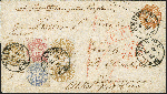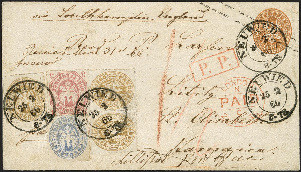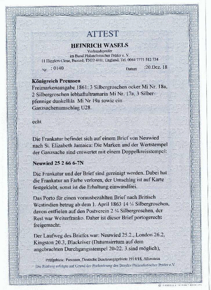 | Zusatzinformationen und Suchstichworte: | 370. Auktion Heinrich Köhler 8. Juni 2019 Los 235 1861/65, Wappenausgabe 2 Silbergroschen ultramarin mit 3 Einzelwerten 3 Silbergroschen ocker und Ergänzungswert 3 Pfennig dunkelrosalila als Zufrankatur auf Ganzsachenumschlag 3 Silbergroschen braun mit Doppelkreisstempel "NEUWIED 25 2 66" und Leitvermerk "via Southampton England" nach Jamaika; hier aufgrund unklarer Adressangabe nachgesandt mit rückseitigen Transitstempeln von Kingston, Pourus, Blackriver and Mandeville. Das Kuvert wurde gereinigt (dadurch die Farben der Marken etwas verblasst) und ist in den Faltungen meist getrennt, daher auf Pappe befestigt, sonst einwandfrei. Portogerechte und attraktive 14¼ Silbergroschen-Frankatur mit außerordentlich seltener Karibik-Destination. Fotoattest Wasels BPP (2018) Ausruf 500,00 EUR Zuschlag 3.600,00 EUR (aus der Sammlung Erivan Haub) |
