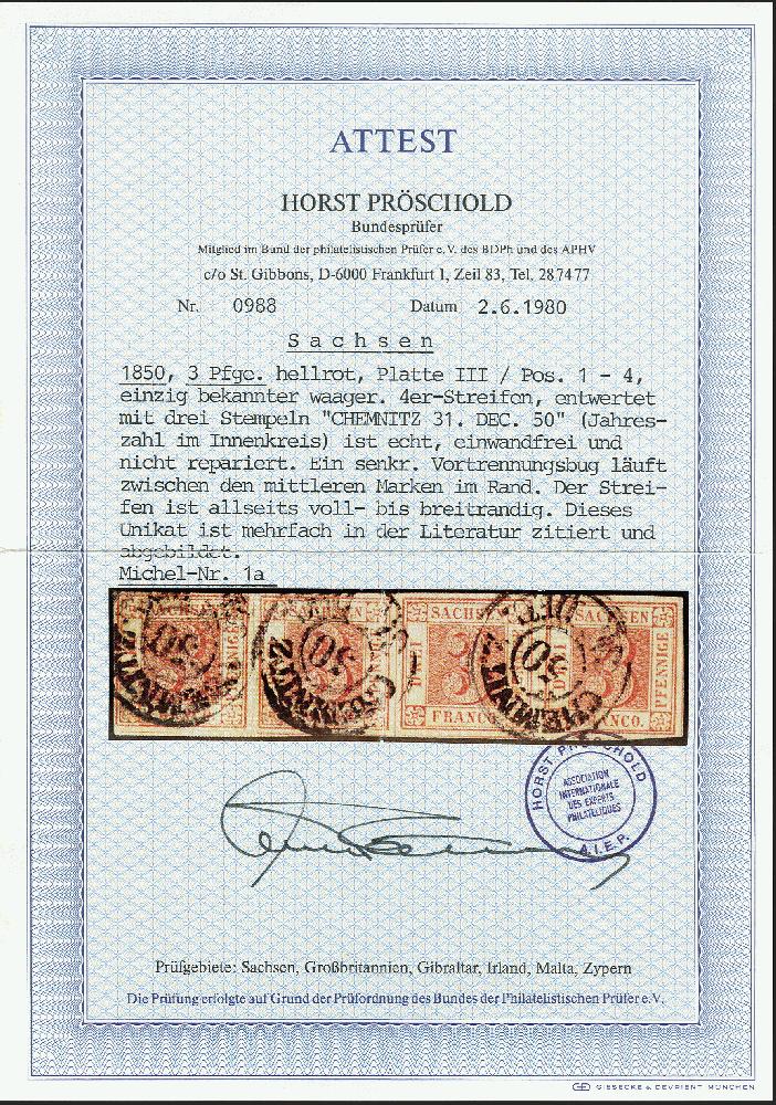 | Zusatzinformationen und Suchstichworte: | 370. Auktion Heinrich Köhler 8. Juni 2019 Los 255 1850, 3 Pfennige hellrot, Platte III, waagerechter 4er-Streifen der Bogenpositionen 1-4, sehr schön farbfrisch und allseits voll- bis meist breitrandig, unten und rechts mit Zwischenlinien, daran das bayerische Liniensystem sehr schön erkennbar, sauber entwertet durch Doppelkreisstempel "CHEMNITZ 31 DEC. 50". Ein senkrechter Vortrennbug in der Mitte berührt die Markenbilder nicht und ist rückseitig leicht verstärkt, sonst einwandfreie Erhaltung. Eine der großen Seltenheiten der Altdeuschen Staaten; zusammen mit dem ebenfalls einmaligen 4er-Block die größte noch existierende gebrauchte Einheit der ersten Marke Sachsens und ein Kronjuwel der deutschen Philatelie das noch niemals auf einer öffentlichen Auktion angeboten wurde. Signiert Bartels sowie 2 Fotoatteste Pröschold BPP (1975 und 1980) Ausruf 80.000,00 EUR Zuschlag 90.000,00 EUR (aus der Sammlung Erivan Haub) |