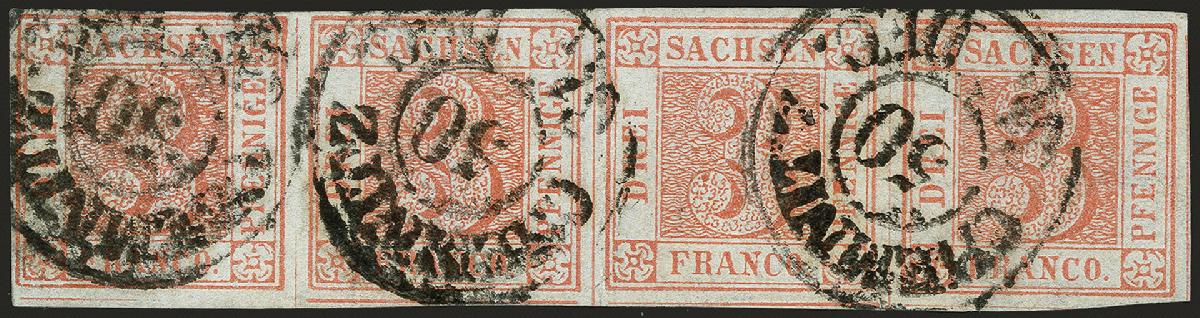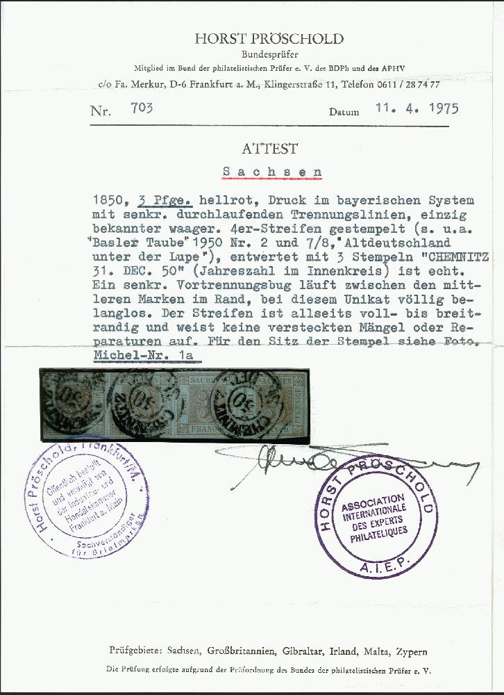 | Zusatzinformationen und Suchstichworte: | 370. Auktion Heinrich Köhler 8. Juni 2019 Los 255 1850, 3 Pfennige hellrot, Platte III, waagerechter 4er-Streifen der Bogenpositionen 1-4, sehr schön farbfrisch und allseits voll- bis meist breitrandig, unten und rechts mit Zwischenlinien, daran das bayerische Liniensystem sehr schön erkennbar, sauber entwertet durch Doppelkreisstempel "CHEMNITZ 31 DEC. 50". Ein senkrechter Vortrennbug in der Mitte berührt die Markenbilder nicht und ist rückseitig leicht verstärkt, sonst einwandfreie Erhaltung. Eine der großen Seltenheiten der Altdeuschen Staaten; zusammen mit dem ebenfalls einmaligen 4er-Block die größte noch existierende gebrauchte Einheit der ersten Marke Sachsens und ein Kronjuwel der deutschen Philatelie das noch niemals auf einer öffentlichen Auktion angeboten wurde. Signiert Bartels sowie 2 Fotoatteste Pröschold BPP (1975 und 1980) Ausruf 80.000,00 EUR Zuschlag 90.000,00 EUR (aus der Sammlung Erivan Haub) |