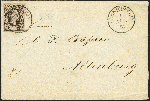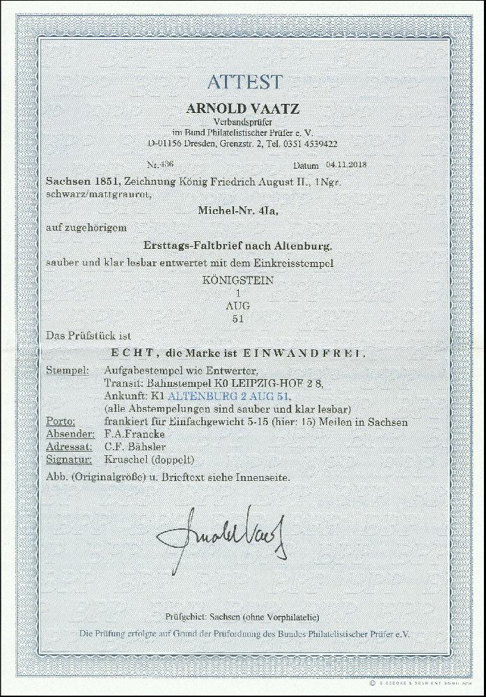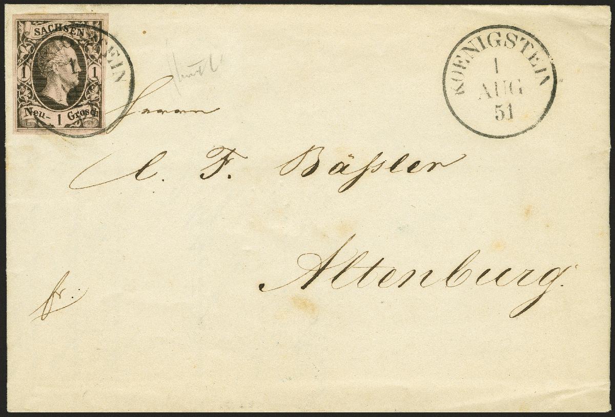 | Zusatzinformationen und Suchstichworte: | 370. Auktion Heinrich Köhler 8. Juni 2019 Los 256 1851, König Friedrich August II. 1 Neugroschen schwarz auf mattgraurot, sehr schön farbfrisch und gut voll- bis meist breitrandig mit sauber auf- und zusätzlich nebengesetztem Ersttagsstempel "KOENIGSTEIN 1 AUG 51" auf komplettem Faltbrief nach Altenburg mit rückseitigem Bahnpoststempel "LEIPZIG-HOF" und blauem Ankunftsstempel vom nächsten Tag. Der Brief rückseitig unbedeutende Randschürfung und einige minimale, ganz leichte Stockflecken, sonst tadellos. Ein besonders schöner und seltener Ersttagsbrief. Fotoattest Vaatz BPP (2018) Ausruf 1.000,00 EUR Zuschlag 5.500,00 EUR (aus der Sammlung Erivan Haub) |