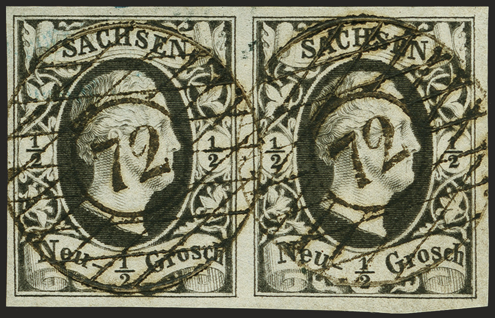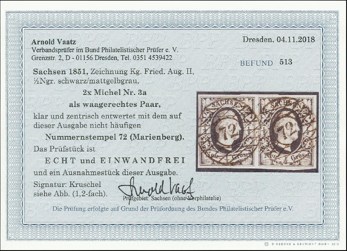 | Zusatzinformationen und Suchstichworte: | 370. Auktion Heinrich Köhler 8. Juni 2019 Los 257 1851, König Friedrich August II. ½ Neugroschen schwarz auf mattgrau, waagerechtes Paar, allseits breitrandig und farbfrisch, beide Werte mit jeweils glasklar aufgesetztem Nummernstempel "72" MARIENBERG, Luxus. Signiert Kruschel und Fotobefund Vaatz BPP (2018) Ausruf 200,00 EUR Zuschlag 480,00 EUR (aus der Sammlung Erivan Haub) |