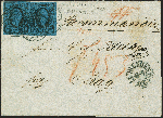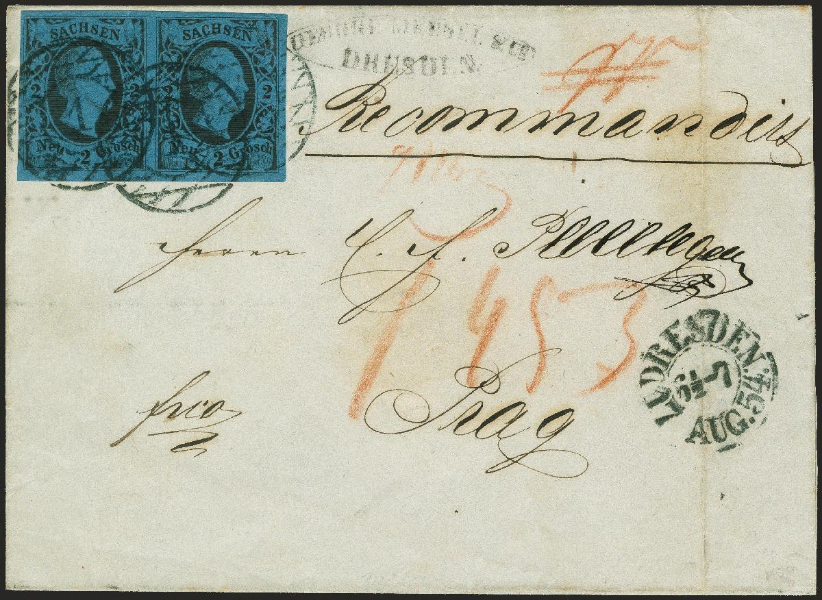 | Zusatzinformationen und Suchstichworte: | 370. Auktion Heinrich Köhler 8. Juni 2019 Los 258 1852, Farbänderung 2 Neugroschen schwarz auf dunkelblau im waagerechten Paar, allseits breitrandig und in schöner frischer Farbe, mit dreifach aufgesetztem Nummernstempel "1" und nebengesetztem Aufgabestempel "DRESDEN 17 AUG 54" auf rekommandierter Briefhülle nach Prag. Senktrechte Aktenfaltung außerhalb der Frankatur. Ein attraktiver Brief im Wechselverkehr mit Österreich. Fotoattest Vaatz BPP (2018) Ausruf 150,00 EUR unverkauft (aus der Sammlung Erivan Haub) |