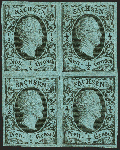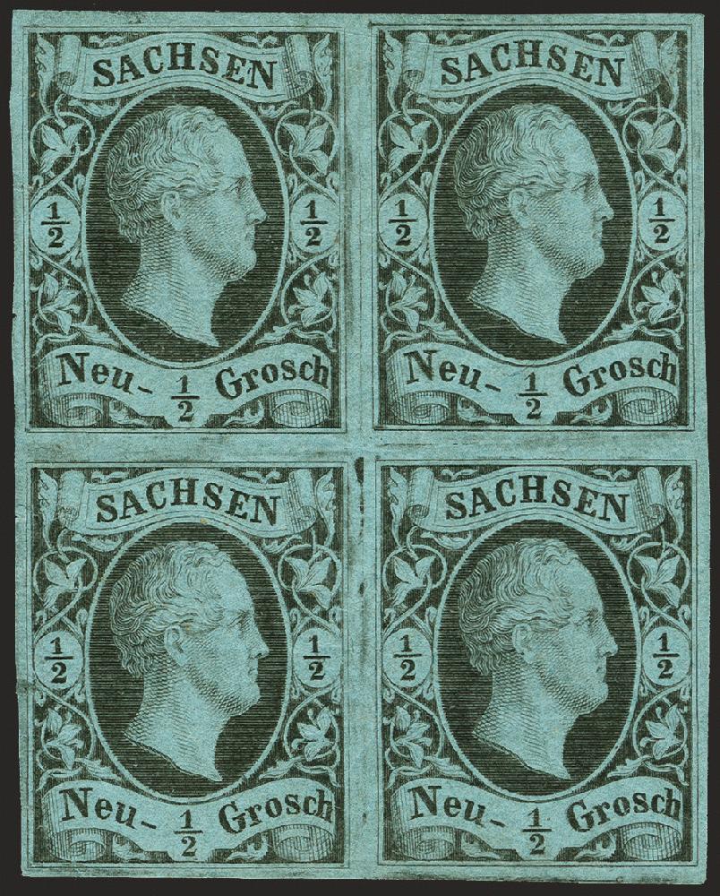 | Zusatzinformationen und Suchstichworte: | 370. Auktion Heinrich Köhler 8. Juni 2019 Los 259 1851, König Friedrich August II. der Farbfehldruck ½ Neugroschen schwarz auf mattpreußischblau im 4er-Block, sehr schön farbfrisch und allseits voll- bis meist breitgerandet, ungebraucht mit frischem Originalgummi, die rechte obere Marke mit kleiner hellen Stelle (teils hinterlegt), die beiden linken Werte haben -wie fast alle Marken des Fehldruckes- ganz wenige winzige Sandkornlöcher, wovon lediglich eins im äußeren Rand der unteren Marke auffällt. Es handelt sich hier um den einzig bekannten 4er-Block dieser Marke, der zugleich die zweitgrößte bekannte Einheit dieses selteten Fehldruckes darstellt. Eine der großen Seltenheiten der Altdeutschland-Philatelie in sehr schöner frischer Erhaltung. Signiert W. H. Colson, Drahn und Opitz sowie Fotoattest Vaatz BPP (2018) Ausruf 40.000,00 EUR unverkauft (aus der Sammlung Erivan Haub) |