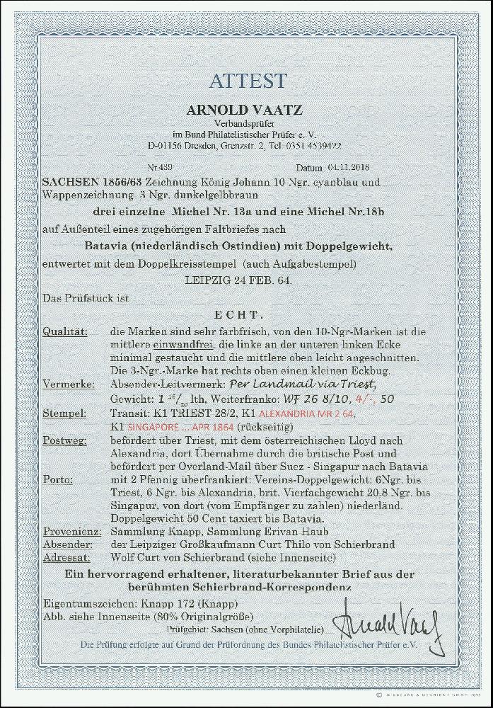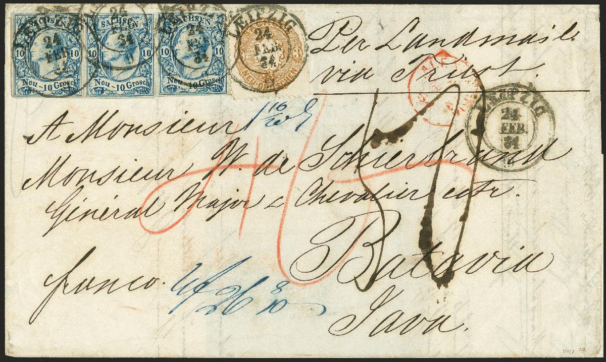 | Zusatzinformationen und Suchstichworte: | 370. Auktion Heinrich Köhler 8. Juni 2019 Los 262 10 Neugroschen blau, 3 Einzelwerte, zusammen mit Wappenausgabe 3 Neugroschen dunkelgelbbraun, alle sehr schön frisch, mit sauber auf- und nebengesetztem Doppelkreisstempel "LEIPZIG 24 FEB. 64" auf Briefhülle der 2. deutschen und niederländischen- bzw. der 4. englischen Gewichtsstufe, über Triest, Alexandria und Singapur nach Batavia auf Java, Niederländisch-Indien. Der Brief ist frankiert und bezahlt bis Singapur mit 6 Neugroschen Vereinsporto, 6 Neugroschen österreichischem Seeporto bis Alexandria und 20/18 Neugroschen britischem Porto bis Singapur. Das Porto für die Beförderung mit niederländischem Schiff von Singapur bis Batavia in Höhe von "50" Cents wurde vom Empfänger eingezogen. Zwei 10 Neugroschen-Werte einseitig leicht berührt bzw. etwas angeschitten, der links klebende kleine Eckstauchung; die 3 Neugroschen völlig unerheblicher kleiner Eckbug. Insgesamt sehr frische und ursprüngliche Erhaltung. Der wohl spektakulärste Brief der bekannten Schierbrand-Korrespondenz. Fotoattest Vaatz BPP (2018) Ausruf 10.000,00 EUR Zuschlag 16.000,00 EUR (aus der Sammlung Erivan Haub) |
