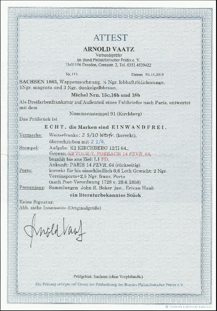 | Zusatzinformationen und Suchstichworte: | 370. Auktion Heinrich Köhler 8. Juni 2019 Los 264 1863/67, Wappenausgabe ½ Neugroschen lebhaftrötlichorange, 1 Neugroschen magenta und 3 Neugroschen dunkelgelbbraun, alle farbfrisch und einwandfrei gezähnt mit Nummernstempel "91" und sauber nebengesetztem Aufgabestempel "KIRCHBERG 12/11 64" auf Briefhülle nach Paris. Eine sehr attraktive und nicht häufige Farbfrankatur in einwandfreier Erhaltung. Ausruf 150,00 EUR Zuschlag 420,00 EUR (aus der Sammlung Erivan Haub) |