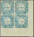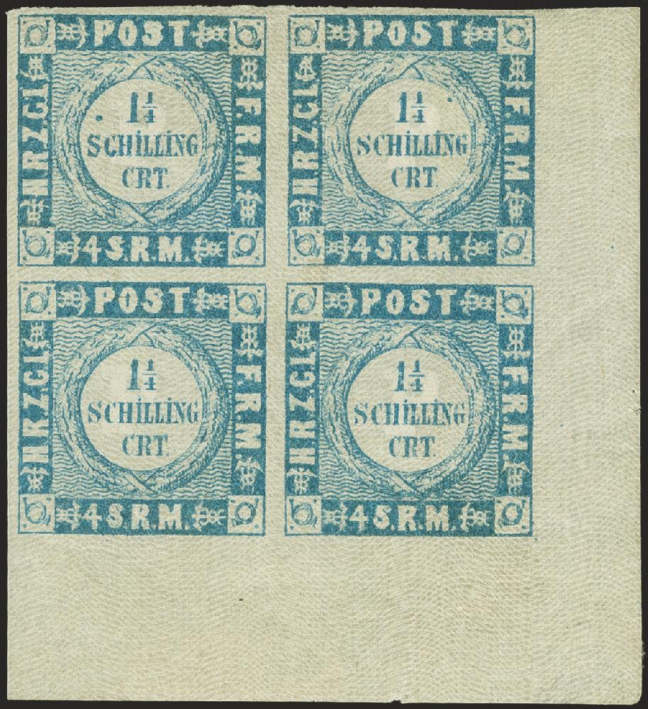 | Zusatzinformationen und Suchstichworte: | 370. Auktion Heinrich Köhler 8. Juni 2019 Los 273 1864, weit gewellter Grund 1 ¼ Schillinge grauultramarin im 4er-Block aus der rechten unteren Bogenecke, farbfrisch und allseits breitrandig mit ca. 8/12 mm Bogenrändern, ungebraucht mit frischem Originalgummi und Falzresten, die linke untere Marke postfrisch; sehr schöne und tadellose Erhaltung. Einheiten dieser Marke sind außerordentlich selten; der 4er-Block ist die größte bekannte Einheit dieser Marke und die Köhler-Kartei hat nur einen weiteren (jedoch ohne Bogenränder) registriert. Signiert Friedl und Fotoattest Moeller BPP (2018) Ausruf 5.000,00 EUR Zuschlag 15.000,00 EUR (aus der Sammlung Erivan Haub) |