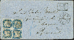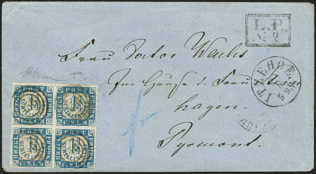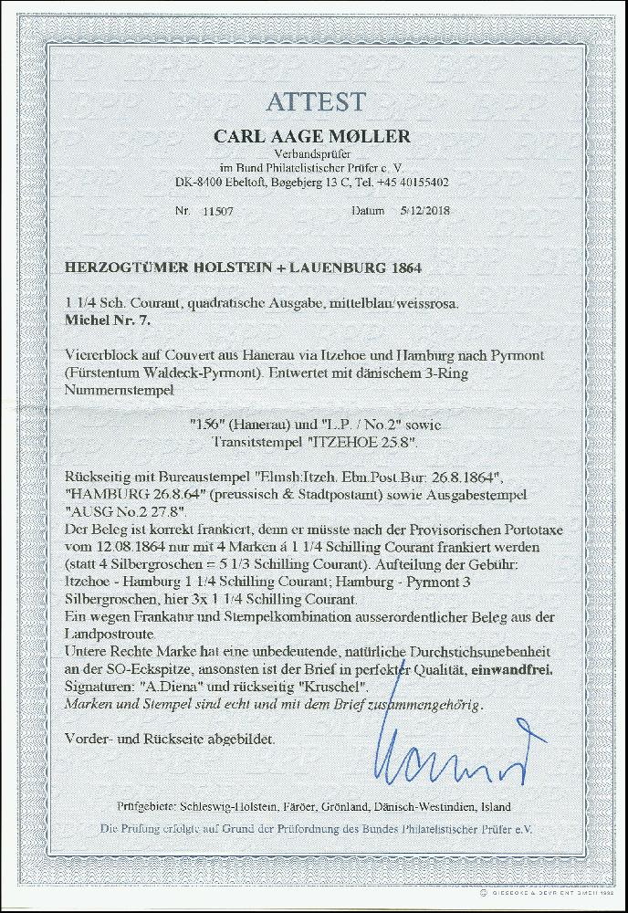 | Zusatzinformationen und Suchstichworte: | 370. Auktion Heinrich Köhler 8. Juni 2019 Los 275 1864, 1 ¼ Schilling blau/rosa im 4er-Block, farbfrisch und mit vollem Durchstich (rechts unten minimal unregelmäßig) mit auf jeder Marke abgeschlagenem Nummernstempel "156" von Hanerau mit entsprechendem nebengesetzten Landpoststempel "L.P.No. 2" und Transitstempel "ITZEHOE 25/8" (1864) auf Briefkuvert nach Pyrmont im Fürstentum Waldeck-Pyrmont. Der Brief ist portogerecht frankiert nach der provisorischen Portotaxe vom 12.8.1864 mit 1 ¼ Schilling bis Hamburg und 3 3/4 Schilling (= 3 Silbergroschen) für die Strecke Hamburg - Pyrmont. Ein schöner und in dieser Form seltener Landpost-Brief. Signiert A. Diena und Kruschel sowie Fotoattest Moeller BPP (2018) Ausruf 1.000,00 EUR Zuschlag 1.400,00 EUR (aus der Sammlung Erivan Haub) |