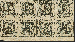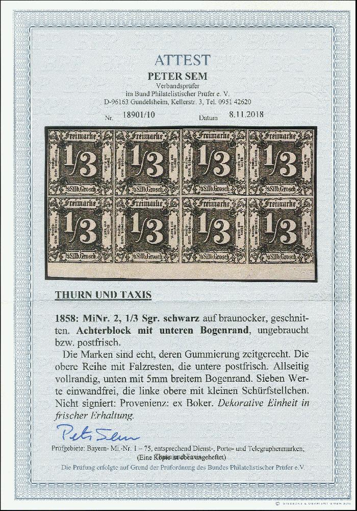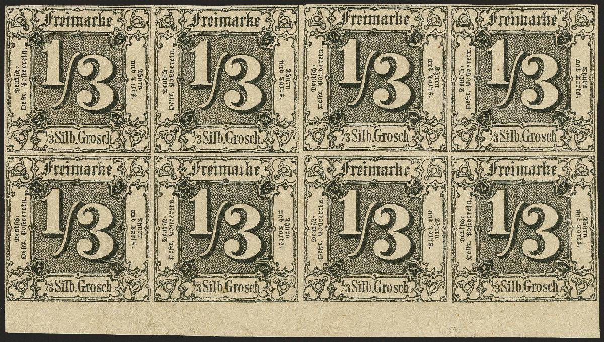 | Zusatzinformationen und Suchstichworte: | 370. Auktion Heinrich Köhler 8. Juni 2019 Los 282 1/3 Silbergroschen schwarz auf braunocker im waagerechten 8er-Block vom unteren Bogenrand, allseits vollrandig und sehr schön farbfrisch, ungebraucht mit Orginalgummi, die untere Reihe postfrisch mit Falzspur im Rand unter den beiden rechten Werten; die linke obere Marke winzige Schürfstelle, sonst völlig tadellos. In dieser Erhaltung eine sehr seltene Einheit. Fotoattest Sem BPP (2018) Ausruf 800,00 EUR Zuschlag 3.400,00 EUR (aus der Sammlung Erivan Haub) |