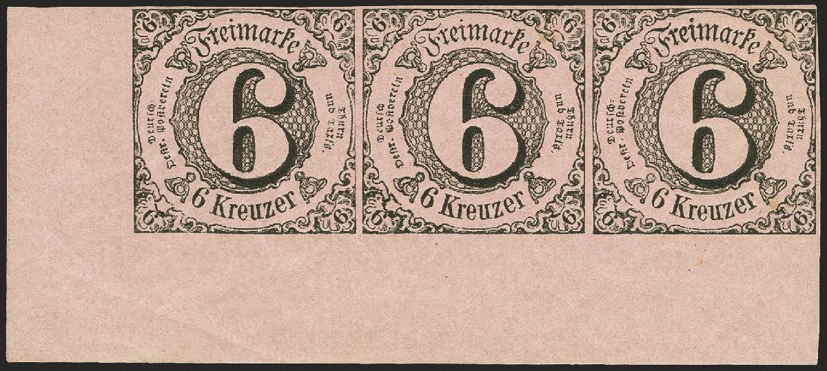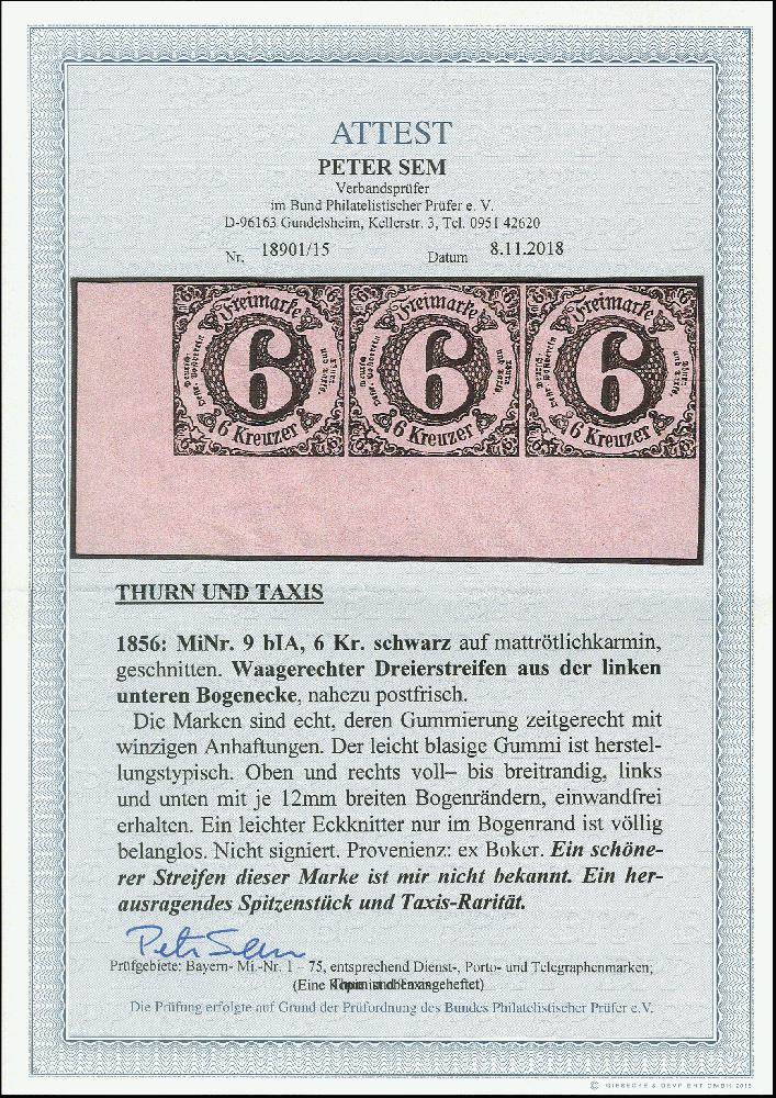 | Zusatzinformationen und Suchstichworte: | 370. Auktion Heinrich Köhler 8. Juni 2019 Los 283 6 Kreuzer schwarz auf mattrötlichkarmin in Type I A, waagerechter 3er-Streifen aus der linken unteren Bogenecke, sehr schön farbfrisch und voll- bis breitrandig mit ca. 12 mm Bogenrändern unten und links, ungebraucht mit Originalgummi. Eine außerordentlich seltene und attraktive Einheit in tadelloser Erhaltung. Der 6 Kreuzer-Wert der ersten Ausgabe ist schon als ungebrauchte Einzelmarke sehr selten, als größere Einheiten haben wir nur zwei fehlerhafte 4er-Blocks sowie den einmaligen 6er-Block aus der Boker-Sammlung registriert. In dieser Erhaltung ein einmaliges Liebhaberstück. Fotoattest Sem BPP (2018) Ausruf 3.000,00 EUR Zuschlag 16.000,00 EUR (aus der Sammlung Erivan Haub) |