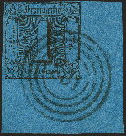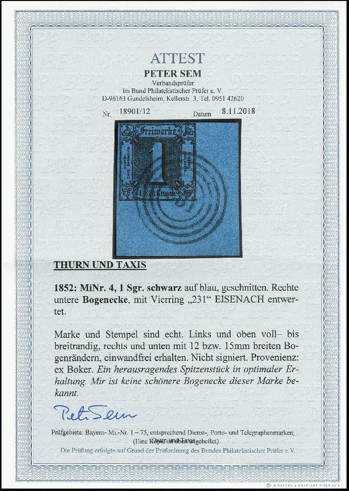 | Zusatzinformationen und Suchstichworte: | 370. Auktion Heinrich Köhler 8. Juni 2019 Los 284 1852, Ausgabe auf farbigem Papier, 1 Silbergroschen schwarz auf blau, rechte untere Bogenecke, oben voll- links breitrandig sowie rechts mit 12 und unten 15 mm breiten Bogenrändern, sehr schöne frische tiefe Farbe, ideal entwertet durch Nummernstempel "231" von Eisenach. Ein sensationelles Stück in tadelloser Erhaltung - schöner nicht möglich! Fotoattest Sem BPP (2018) Ausruf 800,00 EUR Zuschlag 6.000,00 EUR (aus der Sammlung Erivan Haub) |