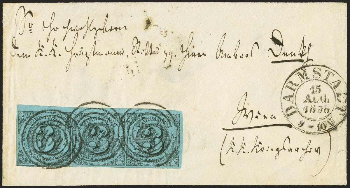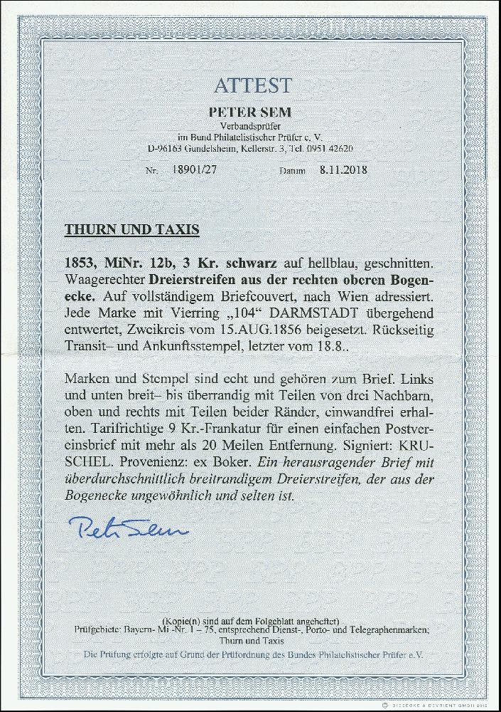 | Zusatzinformationen und Suchstichworte: | 370. Auktion Heinrich Köhler 8. Juni 2019 Los 287 3 Kreuzer schwarz auf mittelgrünlichblau im waagerechten 3er-Streifen aus der rechten oberen Bogenecke, allseits breit- bis überrandig geschnitten, unten mit Teilen aller Nachbarmarken, rechts und oben mit 1,5/2,5 mm Bogenrändern, mit leicht aufgesetztem Nummernstempel "104" und klar nebengesetztem Aufgabestempel "DARMSTADT 15 AUG: 1856" auf Briefkuvert nach Wien mit rückseitigem Bahnpoststempel "EISENACH-HALLE" und Ankunftsstempel vom 18. August. Eine derartig breit geschnittene Einheit, zumal aus der Bogenecke ist bei Thurn und Taxis ganz außergewöhnlich; ein wahrscheinlich eimaliges Stück. Fotoattest Sem BPP (2018) Ausruf 500,00 EUR Zuschlag 2.800,00 EUR (aus der Sammlung Erivan Haub) |