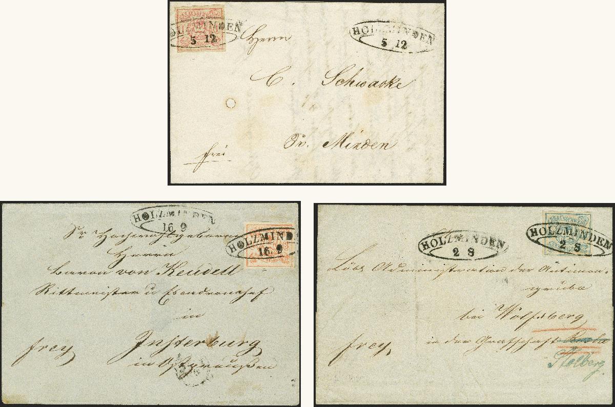 | Zusatzinformationen und Suchstichworte: | 370. Auktion Heinrich Köhler 8. Juni 2019 Los 53 1852, Wappen auf weißem Papier, die vollständige Ausgabe 1 Silbergroschen rosa, 2 Silbergroschen blau und 3 Silbergroschen orangerot, alle farbfrisch und voll- bis meist breitrandig, mit jeweils sauber auf- und zusätzlich nebengesetztem Schnallenstempel von Holzminden als Einzelkfrankaturen auf Briefen (3 Silbergroschen auf Briefhülle) nach Preußen, in den 1., 2. bzw. 3. Rayon. Die 3 Silbergroschen war gelöst, die beiden anderen Werte ursprünglich haftend; in der Vorderseite des 1 Silbergroschen-Briefes kleines Brandloch, sonst schön und einwandfreie Erhaltung. Der vorphilatelistische Schnallenstempel von Holzminden ist als Entwerter sehr selten, wir haben insgesamt nur 8 weitere Briefe der ersten Ausgabe registriert. Jeweils Fotoattest Dr. Wilderbeek BPP (2018) Ausruf 3.000,00 EUR Zuschlag 5.000,00 EUR (aus der Sammlung Erivan Haub) Siehe auch: https://www.briefmarken-atteste.de/atteste/zeigen/6747 https://www.briefmarken-atteste.de/atteste/zeigen/6919 |