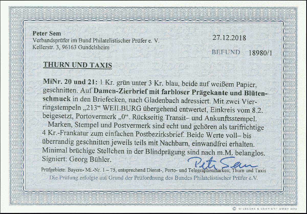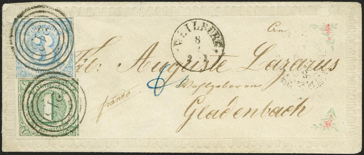 | Zusatzinformationen und Suchstichworte: | 370. Auktion Heinrich Köhler 8. Juni 2019 Los 291 3 Kreuzer blau und 1 Kreuzer grün, beide voll- bis überrandig, insgesamt mit Teilen von 5 Nachbarmarken, mit klar aufgesetztem Nummernstempel "213" und nebengesetztem Einkreisstempel "WEILBURG 8 2" auf kleinem Zierbrief mit farbloser Prägekante und Blütenschmuck nach Gladenbach mit Durchgangs- und Ankunftsstempel. Das Kuvert in der Prägung leicht fehlerhaft, sonst einwandfrei. Ein schöner Zierbrief. Signiert Georg Bühler und Fotobefund Sem BPP Ausruf 200,00 EUR Zuschlag 380,00 EUR (aus der Sammlung Erivan Haub) |