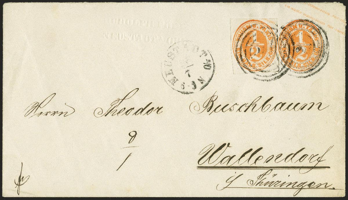 | Zusatzinformationen und Suchstichworte: | 370. Auktion Heinrich Köhler 8. Juni 2019 Los 295 1861/63, Ganzsachenausschnitt ½ Silbergroschen orange, voll- bis breitrandig viereckig geschnitten als wertstufengleiche Zufrankatur auf Ganzsachenumschlag 1863 ½ Silbergroschen orange, mit Nummernstempel "240" und nebengesetztem Einkreisstempel "NEUSTADT A/O 26/7" (1865) nach Wallendorf in Thüringen. Eine in dieser Form seltene und attraktive 1 Silbergroschen-Frankatur. Fotoattest Sem BPP (2018) Ausruf 500,00 EUR Zuschlag 850,00 EUR (aus der Sammlung Erivan Haub) |