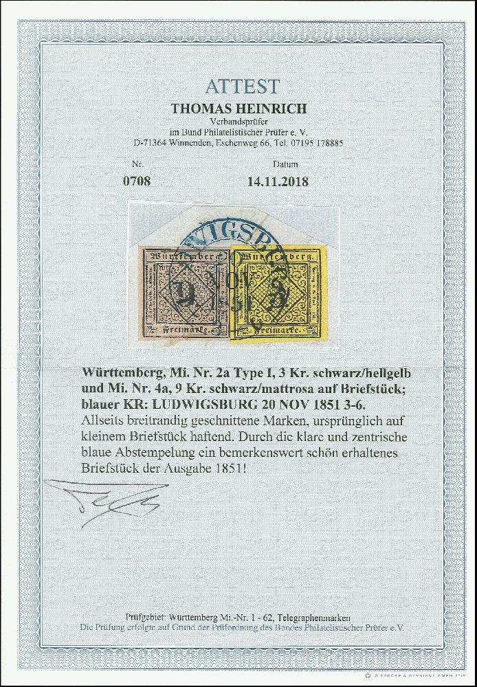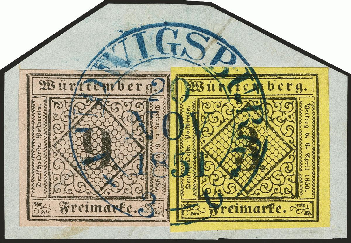 | Zusatzinformationen und Suchstichworte: | 370. Auktion Heinrich Köhler 8. Juni 2019 Los 296 1851, Ziffernausgabe 3 Kreuzer schwarz auf hellgelb und 9 Kreuzer schwarz auf mattrosa, beide farbfrisch und allseits breitrandig mit einem zentrisch klaren Abschlag des großen blauen Doppelkreisstempels "LUDWIGSBURG 20 NOV 1851" auf kleinem Briefstück, Luxus. Signiert Cividini und Fotoattest Heinrich BPP (2018) Ausruf 300,00 EUR Zuschlag 300,00 EUR (aus der Sammlung Erivan Haub) |