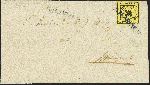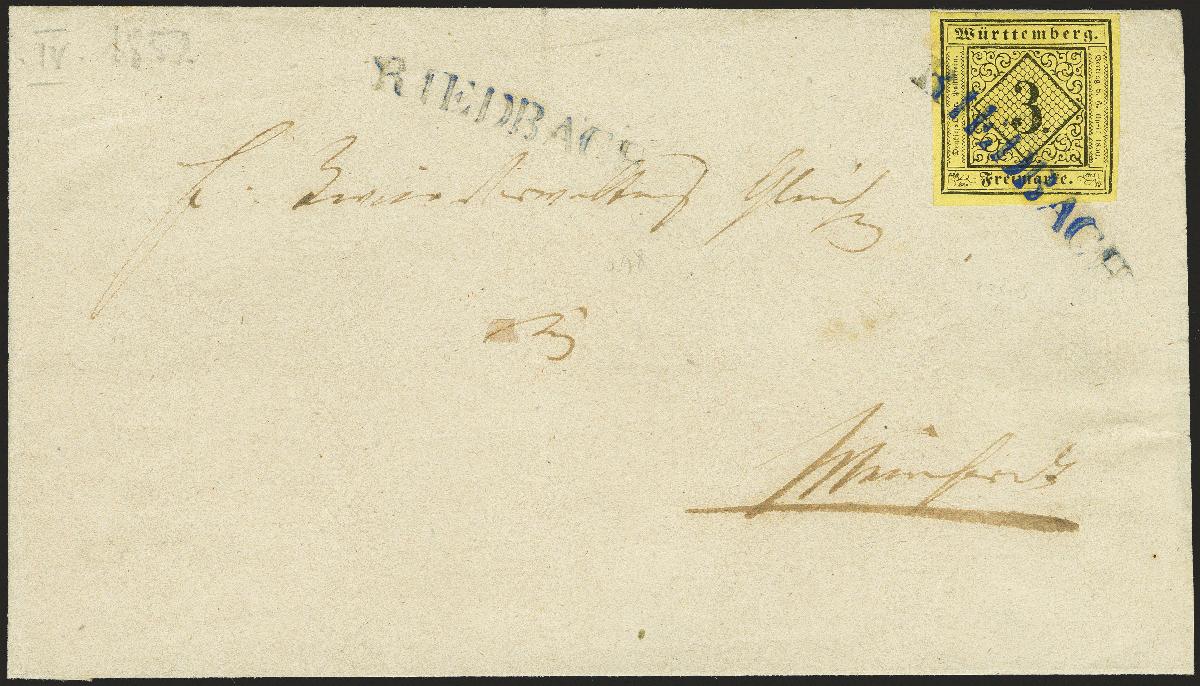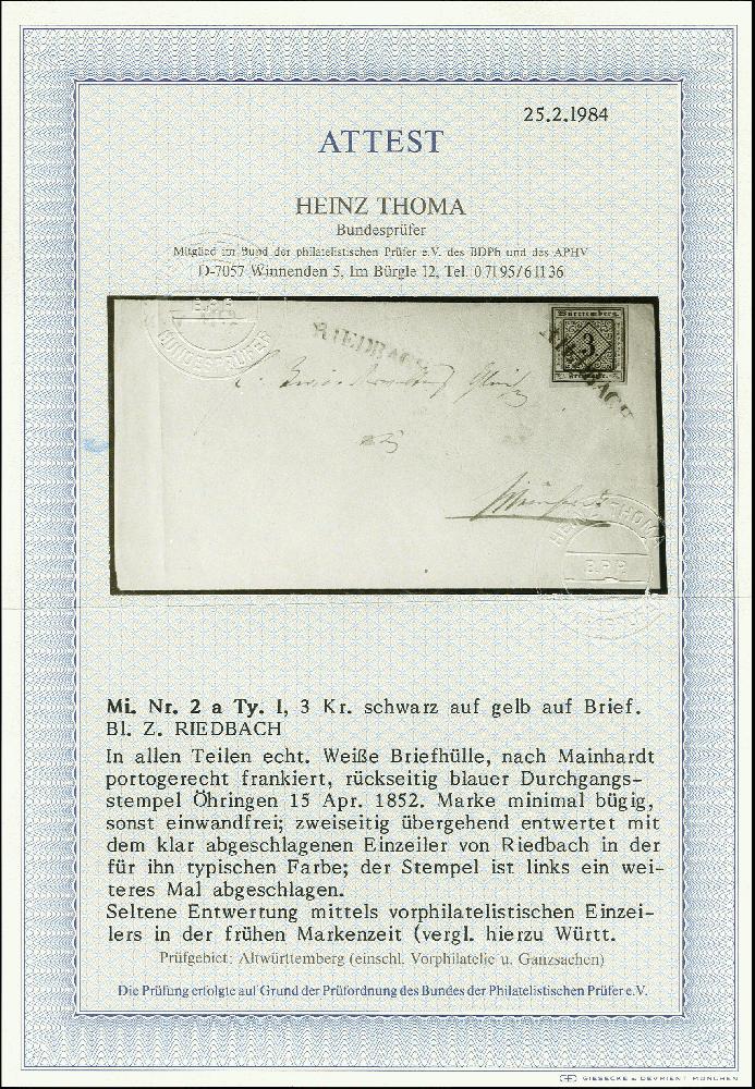 | Zusatzinformationen und Suchstichworte: | 370. Auktion Heinrich Köhler 8. Juni 2019 Los 297 3 Kreuzer schwarz auf hellgelb, farbfrisch und allseits breitrandig, mit sauber auf- und zusätzlich nebengesetztem einzeiligen Langstempel "RIEDBACH" in der für diesen Stempel typischen violettblauen Farbe auf Briefhülle nach Mainhardt mit rückseitigem Durchgangsstempel von Öhringen. Die Marke zeigt minimalste Knitterspuren, sonst tadellose und sehr schöne ursprüngliche Erhaltung. Fotoattest Thoma BPP (1984) Ausruf 500,00 EUR Zuschlag 500,00 EUR (aus der Sammlung Erivan Haub) |