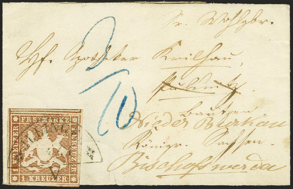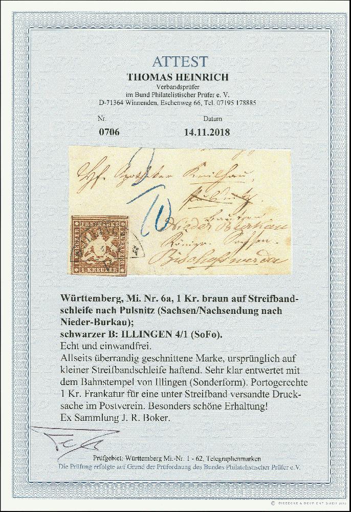| Zusatzinformationen und Suchstichworte: | 370. Auktion Heinrich Köhler 8. Juni 2019 Los 303 1 Kreuzer braun, farbfrisch und allseits überrandig geschnitten, oben und unten mit Teilen der Nachbarmarken, mit klar aufgesetztem Bahnpost-Segmentstempel "ILLINGEN 4/1 V" (Sonderform) auf kleinem Streifband nach Pulsnitz in Sachsen, nachgesandt nach Nieder-Burkau. Ein schönes Stück mit überdurchschnittlicher Marke. Signiert Hermann Toaspern und Fotoattest Heinrich BPP (2018) Ausruf 200,00 EUR Zuschlag 1.300,00 EUR (aus der Sammlung Erivan Haub) |