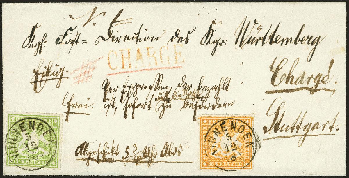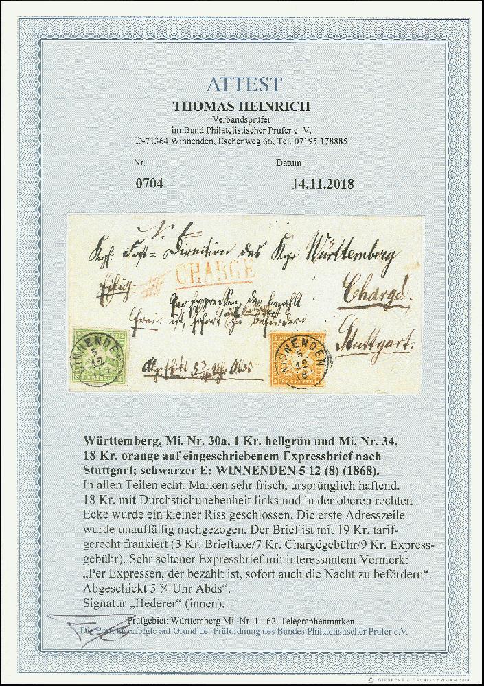 | Zusatzinformationen und Suchstichworte: | 370. Auktion Heinrich Köhler 8. Juni 2019 Los 305 1865/67, Wappenausgabe durchstochen, 18 Kreuzer orange und 1 Kreuzer hellgrün, beide in frischer leuchtender Farbe, mit jeweils glasklar aufgesetztem Kreisstempel "WINNENDEN 5/12" (1868) auf eingeschriebener Express-Briefhülle nach Stuttgart mit handschriftlichem Vermerk "per Expressen der bezahlt ist, sofort auch bei Nacht zu befördern. Abgeschickt 5 3/4 Uhr Abds."; rückseitig Bahnpoststempel. Die 18 Kreuzer mit kleinen Durchstichunebenheiten und in der oberen rechten Ecke winziger Randriss geschlossen; die oberste Adresszeile unauffällig nachgezogen. Ein attraktiver und sehr seltener Express-Brief. Seit 1.1.1868 entfiel bei Expressbriefen die Rekommandationspflicht, war aber gegen zusätzliche Gebühr von 7 Kreuzern möglich, hinzu kam das Briefporto von 3 Kreuzern und 9 Kreuzer Expressgebühr. Ein ganz bemerkenswertes Stück. Signiert Hederer und Fotoattest Heinrich BPP (2018) Ausruf 1.000,00 EUR Zuschlag 5.000,00 EUR (aus der Sammlung Erivan Haub) |
