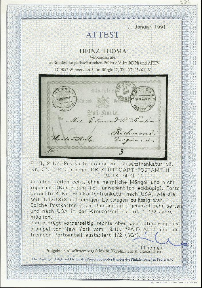 | Zusatzinformationen und Suchstichworte: | 370. Auktion Heinrich Köhler 8. Juni 2019 Los 307 1869, Ovalausgabe 2 Kreuzer orange, farbfrisch und gut durchstochen als wertstufengleiche Zufrankatur auf Postkarte 2 Kreuzer orange von "STUTTGART 24 IX 74" nach Richmond, Virginia mit vorderseitigen roten "NEW YORK PAID ALL OCT 19". Eine attraktive und seltene Transatlantik-Karte. Fotoattest Thoma BPP (1991) Ausruf 500,00 EUR Zuschlag 1.400,00 EUR (aus der Sammlung Erivan Haub) |