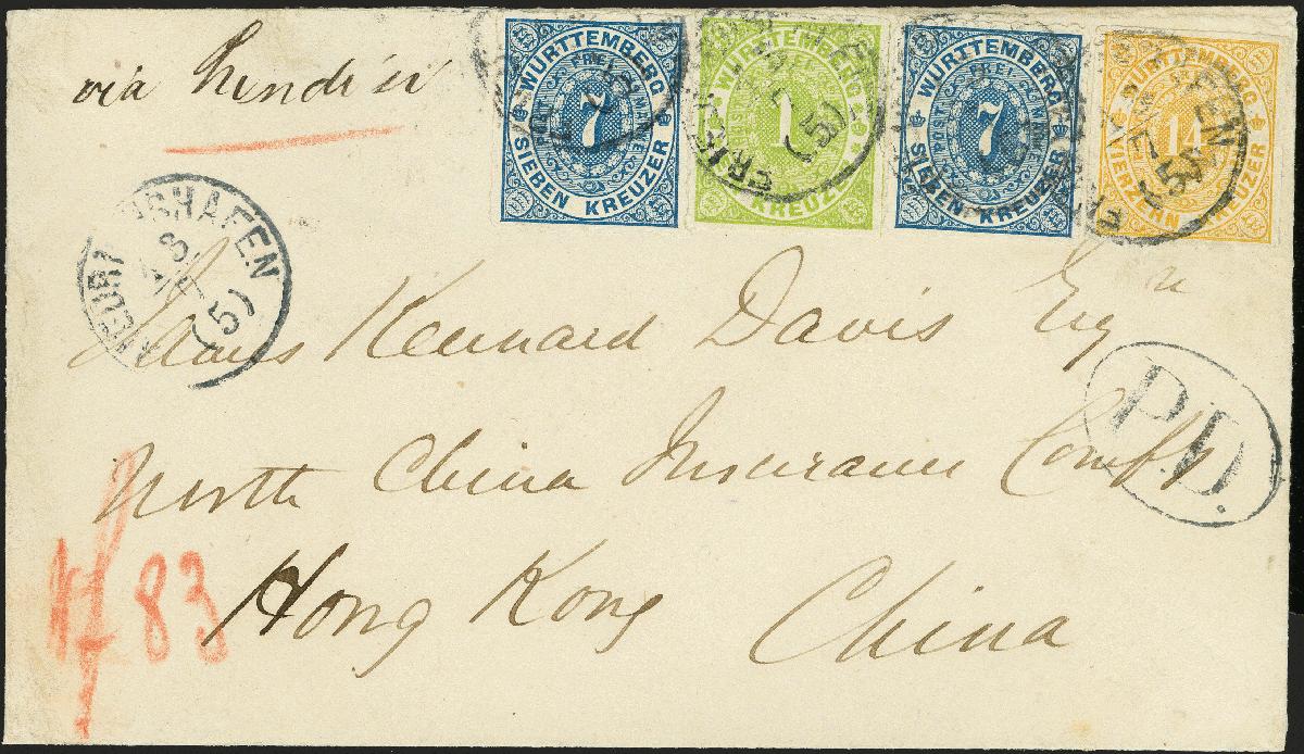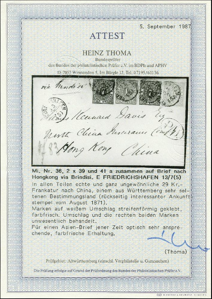 | Zusatzinformationen und Suchstichworte: | 370. Auktion Heinrich Köhler 8. Juni 2019 Los 308 1869, Ovalausgabe 1 Kreuzer grün, zwei Einzelwerte 7 Kreuzer blau und 14 Kreuzer gelborange, abwechslend geklebt mit Einkreisstempel "FRIEDRICHSHAFEN 13/7" (1871) auf Briefkuvert mit Leitvermerk "via Brindisi" nach Hong Kong, China mit rückseitigem klaren "HONG-KONG MARINE-SORTER SINGAPORE-TO HONG-KONG". Die beiden rechten Werte der Frankatur leicht verbessert, sonst einwandfreie Erhaltung. Ein attraktiver und seltener Brief nach Fernost. Fotoattest Thoma BPP (1987) Ausruf 2.000,00 EUR Zuschlag 6.000,00 EUR (aus der Sammlung Erivan Haub) |