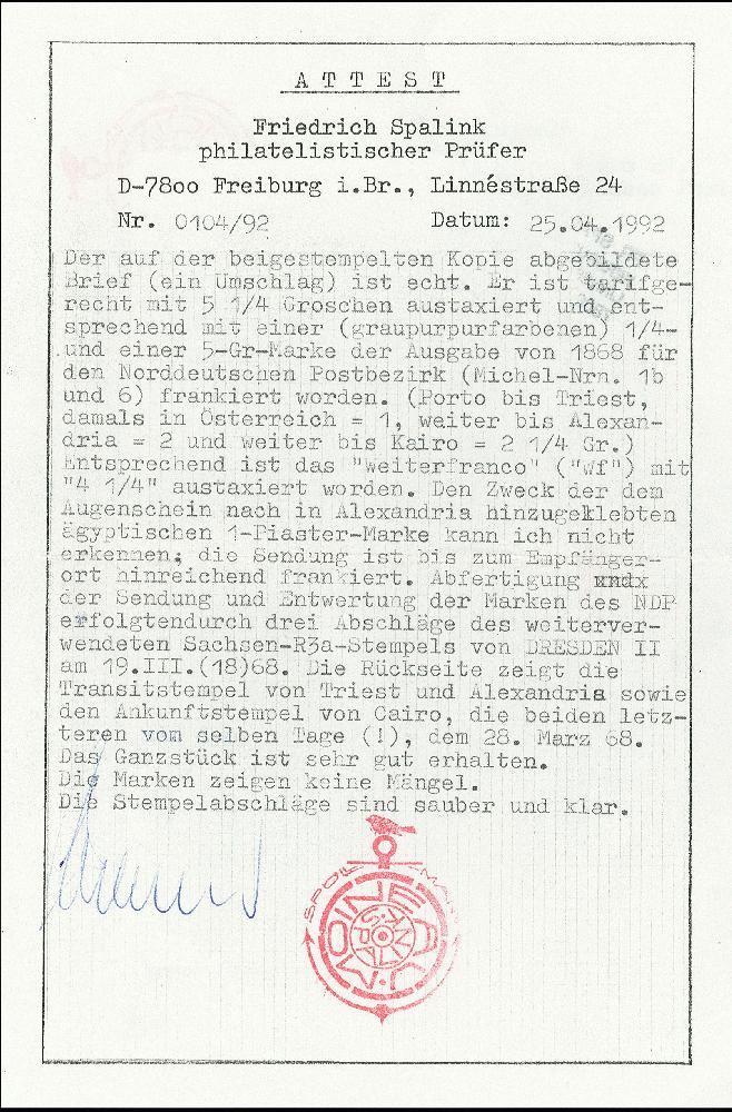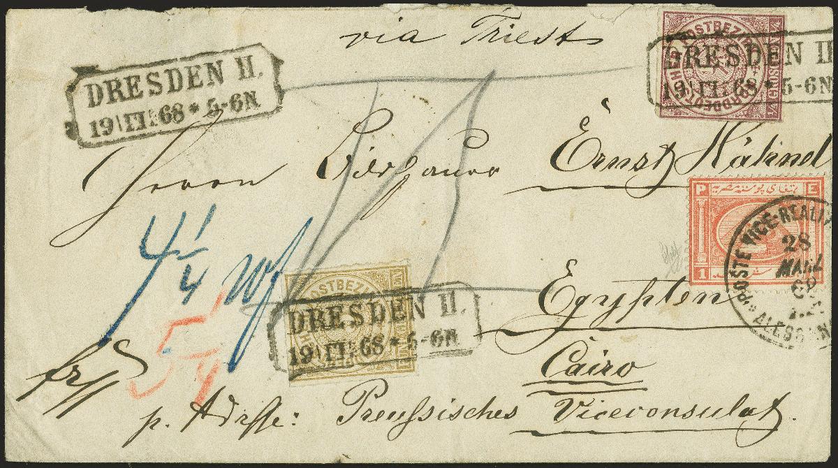 | Zusatzinformationen und Suchstichworte: | 370. Auktion Heinrich Köhler 8. Juni 2019 Los 311 1868, ¼ Groschen violett und 5 Groschen ockerbraun, beide mit sauberem sächsischem Rahmenstempel "DRESDEN II. / 19 III 68" auf Briefkuvert mit Leitvermerk "via Triest" nach Kairo. Der Brief wurde von Triest mit dem österreichischen Lloyd nach Alexandria befördert und dem österreichischem Postamt übergeben; hier frankiert mit Ägypten 1867, 1 Piaster rot und an die ägyptische Staatspost weitergeleitet. Von dieser die ägyptische Marke entwertet durch Einkreisstempel "POSTE VICE-REALI EGIZIANE ALESSANDRIA 28 MARZ. 68" und nach Kairo befördert. Das Porto setzt sich zusammen aus 1 Groschen deutscher Inlandsgebühr sowie 4¼ Groschen Weiterfranko, davon 2 Groschen für die Seepostbeförderung von Triest nach Alexandria sowie 2¼ Groschen für das ägyptischen Porto; nur während einer kurzen Übergangsperiode wurde diese Gebühr als Marke verklebt und nicht anderweitig verrechnet. Es sind nur ganz wenige derartige Kombinationsbriefe bekannt. Atteste Spalink BPP (1992) und Holcombe (1992) Ausruf 3.000,00 EUR Zuschlag 13.000,00 EUR (aus der Sammlung Erivan Haub) |