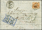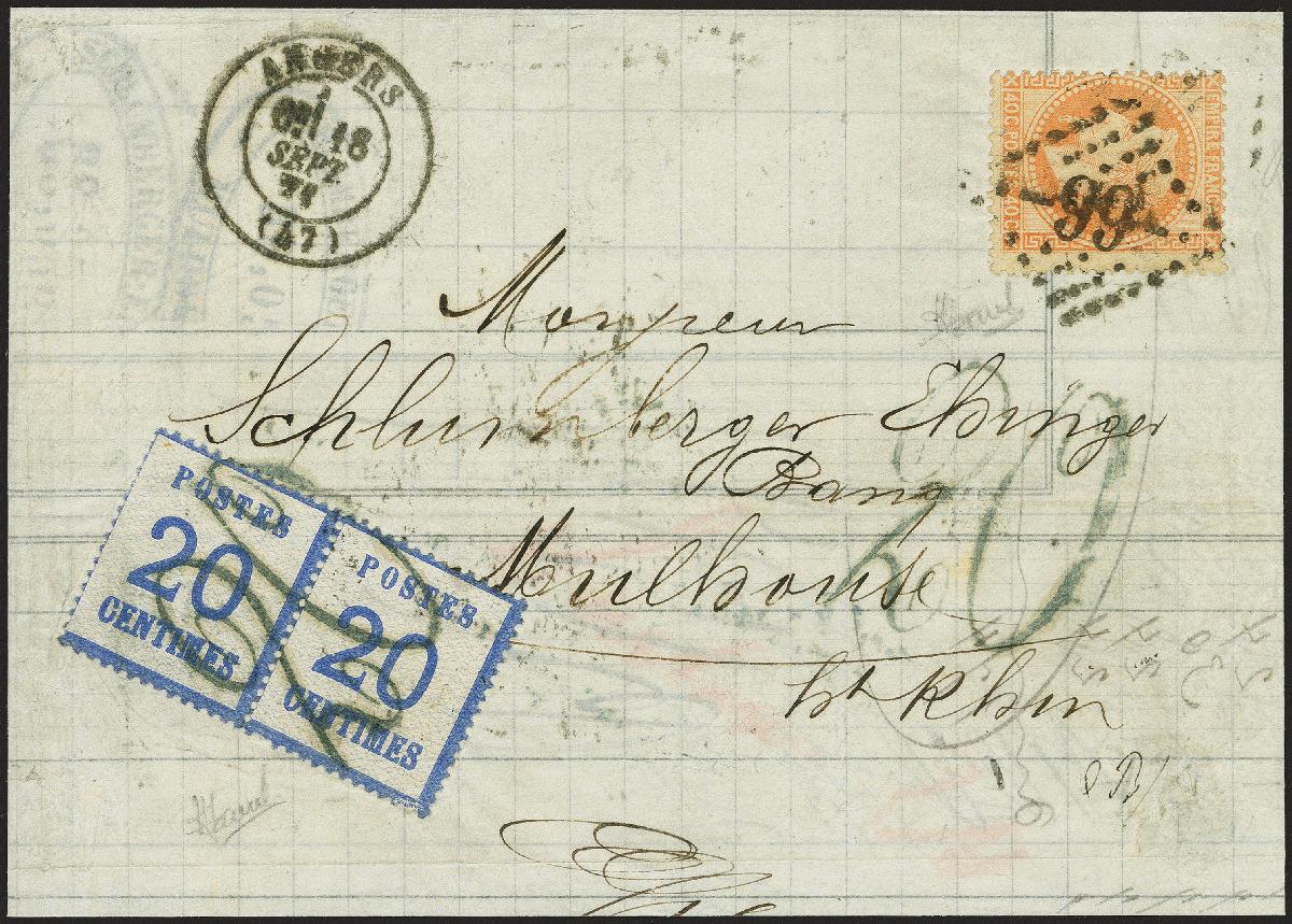 | Zusatzinformationen und Suchstichworte: | 370. Auktion Heinrich Köhler 8. Juni 2019 Los 323 Spitzen aufwärts 20 Centimes ultramarin im waagerechten Paar, übergehend entwertet durch Taxstempel "20" auf Faltbrief der 2. Gewichtsstufe, frankiert mit Napoléon Lauré 40 Centimes mit Nummernstempel "99" und nebengesetztem Doppelkreisstempel "ANGERS 18 SEPT. 71" nach Mülhausen im Elsaß mit Transit- und Ankunftsstempeln. Ein schöner und in dieser Form sehr seltener Brief, Fotoattest P. Scheller (2018) Ausruf 300,00 EUR Zuschlag 800,00 EUR (aus der Sammlung Erivan Haub) |