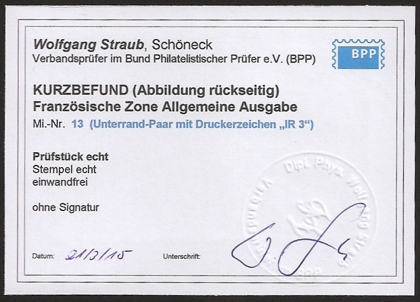 | Prüfer: | Straub, Wolfgang (BPP (Bund Philatelistischer Prüfer)) |