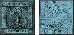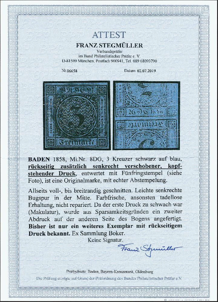 | Zusatzinformationen und Suchstichworte: | 372. Auktion Heinrich Köhler 14. Dezember 2019 Los 6 1858, 3 Kreuzer schwarz auf blau mit zusätzlichem rückseitigem Druck (dieser kopfstehend und senkrecht verschoben), voll- bis breitrandig mit leicht aufgesetztem Nummernstempel. Leichte senkrechte Bugspur, sonst einwandfrei. Da der erste Druckgang zu schwach ausfiel, wurde aus Sparsamkeitsgründen ein zweiter (und dann kräftiger) Druck auf der Rückseite des Bogens angebracht. Eine markante und außerordentlich seltene Abart, wir haben nur ein weiteres Stück (ex Sammlung Bloch) registriert. Fotoattest Stegmüller BPP (2019) Ausruf 5.000,00 EUR Zuschlag 5.000,00 EUR (aus der Sammlung Erivan Haub) |