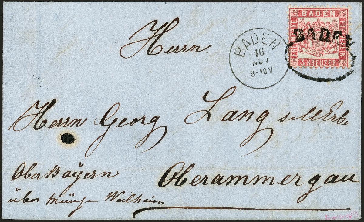 | Zusatzinformationen und Suchstichworte: | 372. Auktion Heinrich Köhler 14. Dezember 2019 Los 8 3 Kreuzer rosa, farbfrisch und einwandfrei gezähnt mit sauber aufgesetztem Ovalstempel "BADEN" ohne Datum, auf komplettem Faltbrief mit nebengesetztem Einkreisstempel "BADEN 16 NOV" (1868) nach Oberammergau. Ein schöner und seltener Brief. Signiert Kruschel und Unverferth, Fotoattest Stegmüller BPP (2019) Ausruf 200,00 EUR Zuschlag 1.000,00 EUR (aus der Sammlung Erivan Haub) |