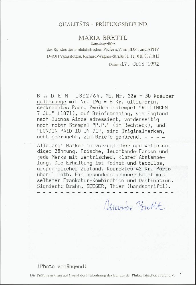 | Zusatzinformationen und Suchstichworte: | 372. Auktion Heinrich Köhler 14. Dezember 2019 Los 13 30 Kreuzer dunkelgelblichorange und senkrechtes Paar 6 Kreuzer ultramarin, alle farbfrisch und einwandfrei gezähnt mit jeweils klar aufgesetztem Doppelkreisstempel "VILLINGEN 7 JUL" (1871) auf Briefkuvert über England nach Buenos Aires, Argentinien. Der Brief ist mit 42 Kreuzern portogerecht frankiert, 10 3/4 Silbergroschen Weiterfranko vorderseitig notiert. Ein besonders schöner Brief mit dem Höchstwert der Wappenausgabe mit seltener Südamerika-Destination. Signiert Drahn, Thier und Seeger sowie Qualitäts-Prüfungsbefund Maria Brettl (1992) und Fotoattest Stegmüller BPP (2019) Ausruf 10.000,00 EUR Zuschlag 16.000,00 EUR (aus der Sammlung Erivan Haub) |