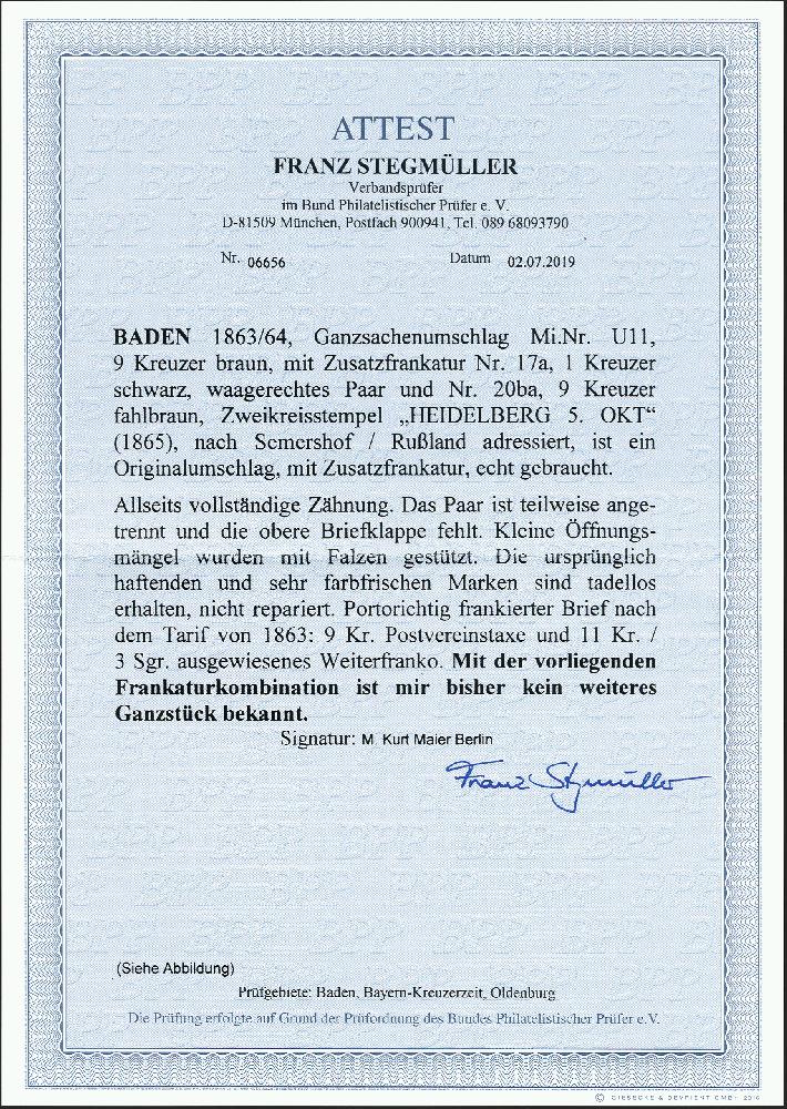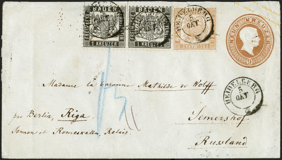 | Zusatzinformationen und Suchstichworte: | 372. Auktion Heinrich Köhler 14. Dezember 2019 Los 16 1863/64, Umschlag 9 Kreuzer braun mit Zufrankatur 1862/66, 9 Kreuzer fahlbraun und 1 Kreuzer schwarz im waagerechten Paar, alle gut gezähnt und farbfrisch (das Paar teilweise getrennt) mit kleinem Doppelkreisstempel "HEIDELBERG 5 OKT" (1865) nach Semershof, Lettland, mit Leitvermerk "par Berlin, Riga, Sennen und Romeskalen, Relais". Der Brief ist portogerecht frankiert nach dem Tarif von 1863 mit 9 Kreuzern Vereinstaxe und 11 Kreuzern (=3 Silbergroschen) Weiterfranko für Rußland. Ein Teil der oberen Rückklappe fehlt, zwei öffnungsbedingte Risse mit Falzen gestützt. Ein attraktiver Auslandsbrief mit einmaliger Frankaturkombination. Signiert Kurt Maier, Berlin und Fotoattest Stegmüller BPP (2019) Ausruf 2.000,00 EUR Zuschlag 2.200,00 EUR (aus der Sammlung Erivan Haub) |