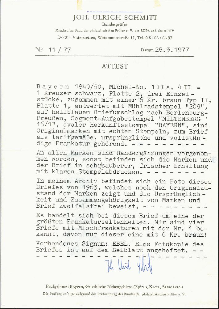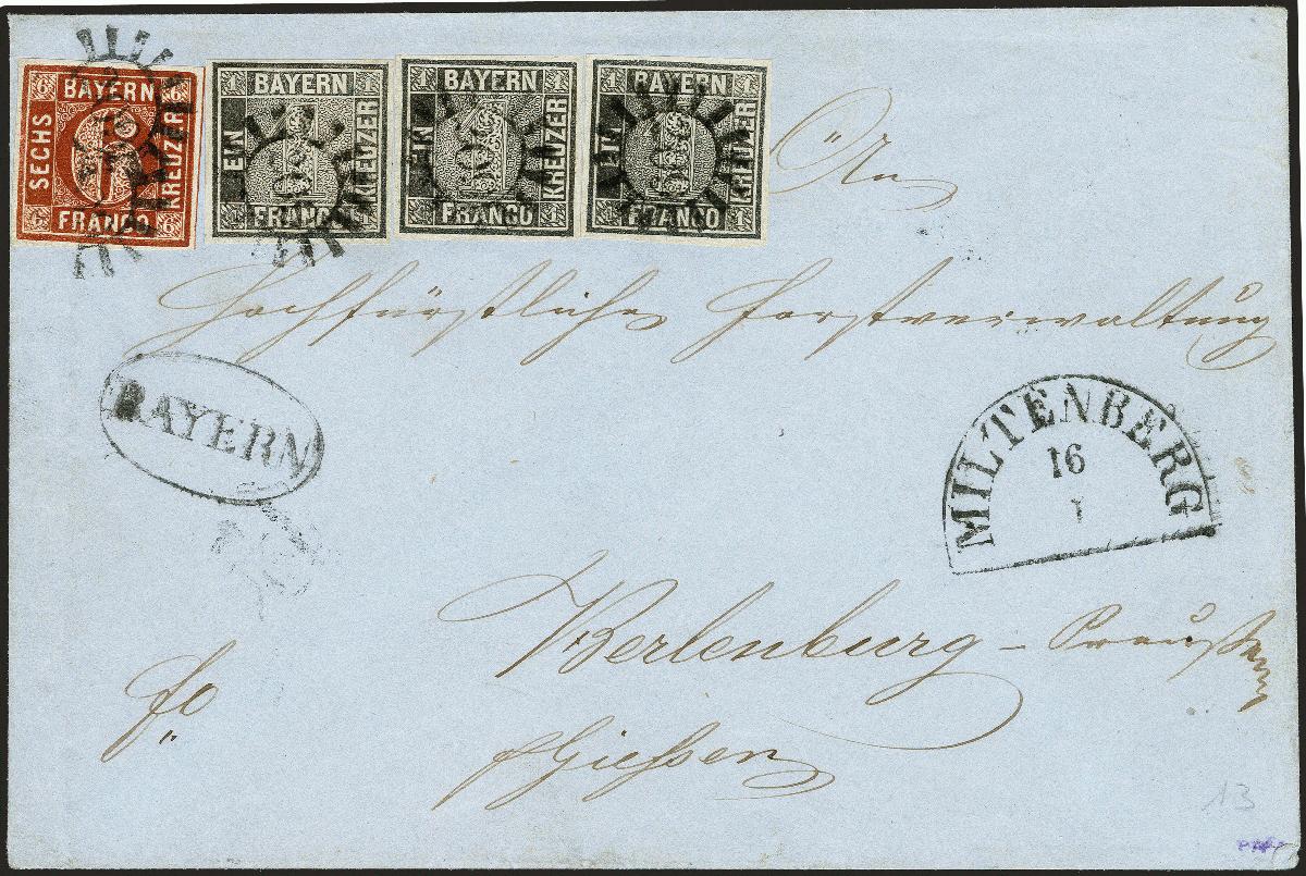 | Zusatzinformationen und Suchstichworte: | 372. Auktion Heinrich Köhler 14. Dezember 2019 Los 18 1849, 1 Kreuzer schwarz, Platte 2, drei Einzelstücke in Mischfrankatur mit 1850/58, 6 Kreuzer braun, Type II, sauber entwertet durch gMR "209" auf Briefkuvert mit nebengesetztem Halbkreis "MILTENBERG 16/1" nach Berleburg in Preußen; nebengesetzter ovaler Transitstempel "BAYERN". Alle Marken mit Randergänzungen, sonst saubere und frische Erhaltung. Bunt- und Mischfrankaturen des 'Schwarzen Einsers' gehören zu den großen Seltenheiten der Bayern-Philatelie. Wir haben insgesamt nur 8 derartige Briefe registriert; bei dem hier angebotenen handelt es sich um die einzige Kombination mit einer 6 Kreuzer braun. Fotoattest Schmitt BPP (1977) Ausruf 15.000,00 EUR Zuschlag 30.000,00 EUR (aus der Sammlung Erivan Haub) |