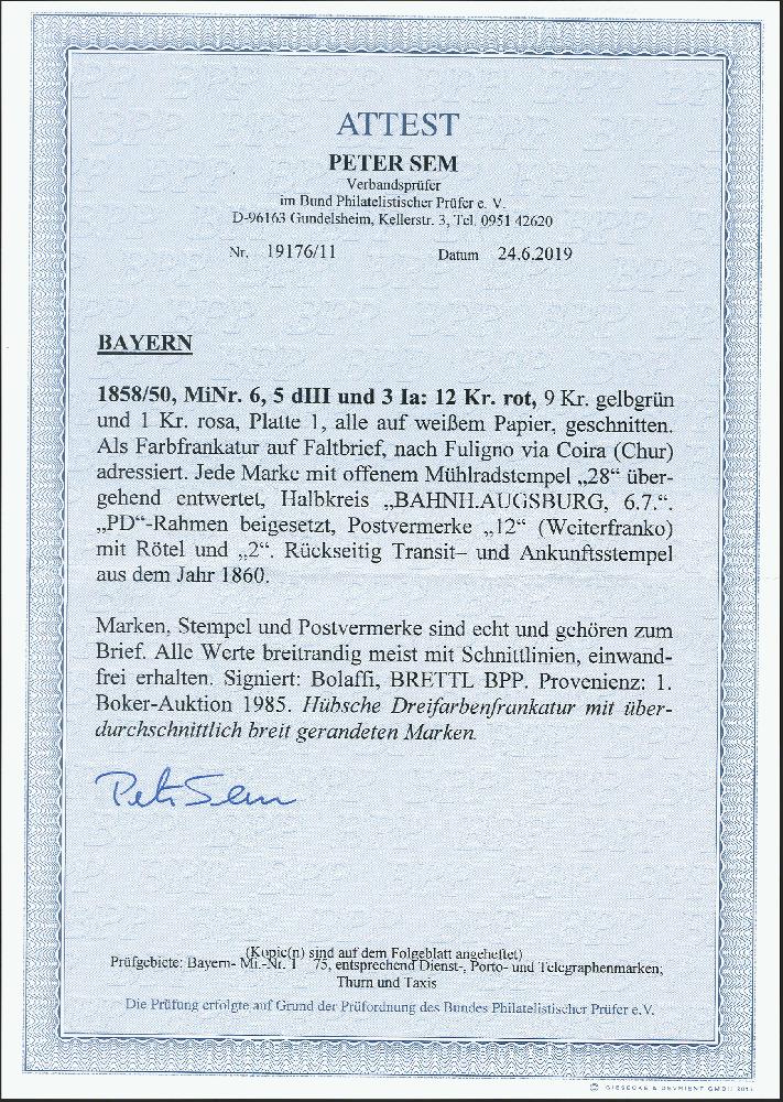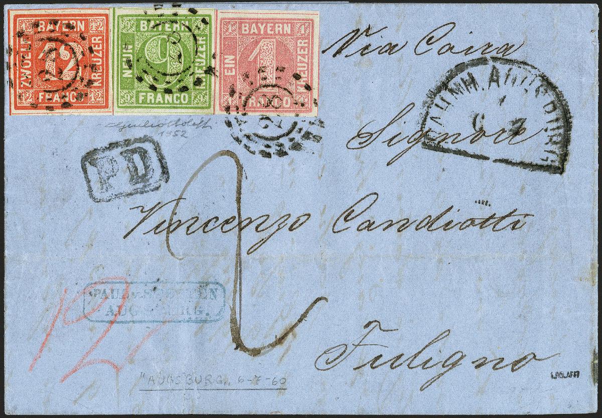 | Zusatzinformationen und Suchstichworte: | 372. Auktion Heinrich Köhler 14. Dezember 2019 Los 25 1 Kreuzer rosa, Platte 1, 9 Kreuzer gelbgrün und 12 Kreuzer rot, alle sehr schön farbfrisch und allseits breitrandig, meist mit Schnittlinien, mit klarem oMR "28" und nebengesetztem Halbkreis "BAHNH. AUGSBURG 6/7" (1860) auf Faltbrief (rückseitig kleiner Teil durch unsachgemäße Öffnung fehlend) über die Schweiz nach Fuligno im Kirchenstaat. Der italienische Portoanteil bei Beförderung über die Schweiz war zum 1.3.1860 auf 6 Kreuzer pro 10 g reduziert worden. Dieser Brief ist noch frankiert nach dem alten Tarif mit 6 Kreuzern Vereinsgebühr, 6 Kreuzern Schweizer Transit und 10 Kreuzern italienischem Porto; die Inlandsgebühr des Kirchenstaates wurde vom Empfänger eingezogen. Eine attraktive und qualitativ herausragende Farbfrankatur, signiert Bolaffi und Brettl BPP, Fotoattest Sem BPP (2019). Ausruf 1.500,00 EUR Zuschlag 5.500,00 EUR (aus der Sammlung Erivan Haub) |