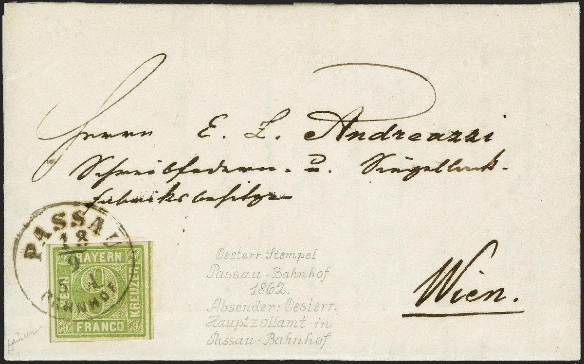 | Zusatzinformationen und Suchstichworte: | 372. Auktion Heinrich Köhler 14. Dezember 2019 Los 30 9 Kreuzer gelbgrün, Type III, sehr schön farbfrisch und allseits breitrandig, dreiseitig mit Zwischenlinien, sauber übergehend entwertet durch den österreichischen Einkreisstempel "PASSAU BAHNHOF 18/9 5. A." auf komplettem Faltbrief des österreichischen Hauptzollamtes im Passauer Bahnhof nach Wien. Das Briefpapier ist in den Faltungen an einigen Stellen leicht gebrochen, sonst tadellose und sehr frische Erhaltung. Dieser Stempel wurde beim österreichischen Postamt im Passauer Bahnhof geführt und diente an sich für die Bestätigung der Kartenschlüsse. Nur in seltene Fällen wurde er als auch Transit- oder Aufgabestempel verwendet und stellt als solcher wohl die größte Stempelseltenheit Bayerns dar. Karl Winkler erwähnt in seinem Handbuch von 1951 nur einen weiteren Brief vom 13.11.1862, der jedoch nie in der Öffentlichkeit oder einer Registratur aufgetaucht ist. Ein höchst bemerkenswertes Stück der bayerischen Postgeschichte. Fotoattest Sem BPP (2019) Ausruf 3.000,00 EUR Zuschlag 4.800,00 EUR (aus der Sammlung Erivan Haub) |