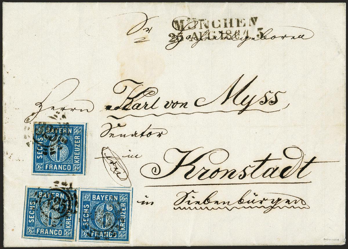 | Zusatzinformationen und Suchstichworte: | 372. Auktion Heinrich Köhler 14. Dezember 2019 Los 33 6 Kreuzer blau, 3 Einzelwerte, alle farbfrisch und voll- bis breitrandig, mit oMR "325" und nebengesetztem zweizeiligem Langstempel "MÜNCHEN 25 AUG. 1864" auf komplettem Faltbrief der 2. Gewichtsstufe nach Kronstadt in Siebenbürgen. Eine attraktive und ungewöhnliche Mehrfachfrankatur im Wechselverkehr mit dem Kaiserreich Österreich. Signiert Brettl BPP mit Fotoattest (1989) Ausruf 200,00 EUR Zuschlag 900,00 EUR (aus der Sammlung Erivan Haub) |